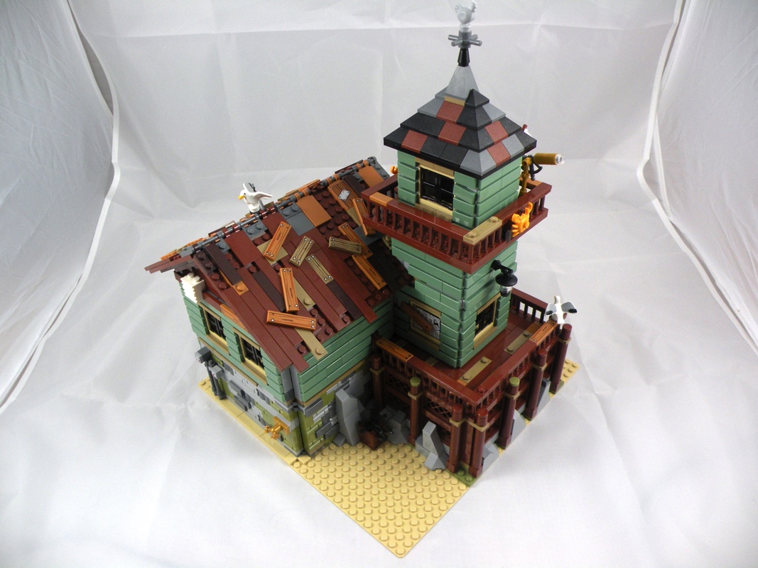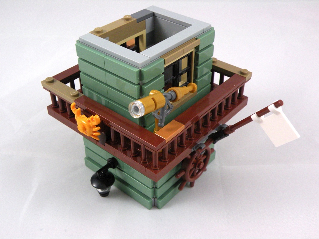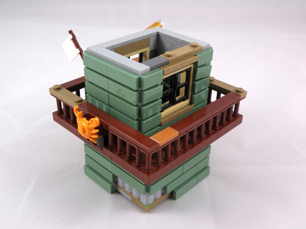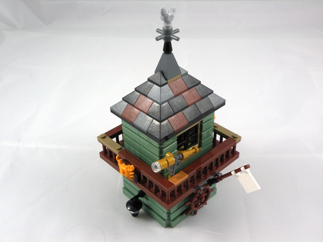 Et oui, il est déjà temps de s’intéresser à la dernière étape de construction de notre vieux magasin de pêche… C’est l’un des points forts de ce modèle : la monotonie ne s’installe jamais lors de la construction, il y a toujours un petit quelque chose qui vous pousse à aller encore un peu plus loin. Cette septième étape consiste à terminer la tour sur la partie gauche du magasin. Celle-ci se décompose en trois morceaux afin d’accéder à l’intérieur du rez-de-chaussée et du premier étage. On y ajoute un balcon (qui fait malheureusement seulement 2 tenons de large… difficile d’y disposer une minifig), et une échelle disposée à l’intérieur de la tour. On termine cet assemblage avec la toiture multicolore et sa girouette, une longue-vue et un drapeau blanc.