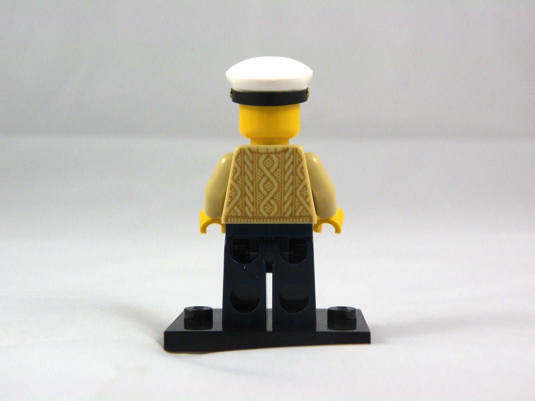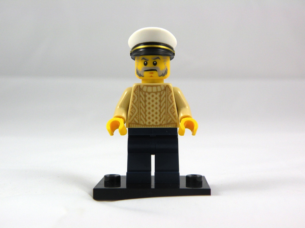 Un pantalon bleu et un pull en laine couleur tan composent la garde-robe de notre capitaine. Ce pull est une nouveauté, et sa casquette n’a jusqu’ici été vue qu’une seule fois dans la série 10 de minifigures à collectionner. Sa tête, superbement travaillée avec sa barbe, sa moustache et ses sourcils grisonnants, apparaît pour la quatrième fois ici.