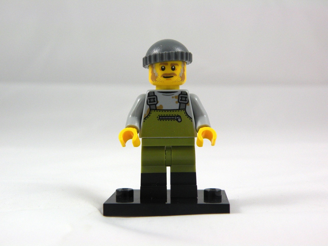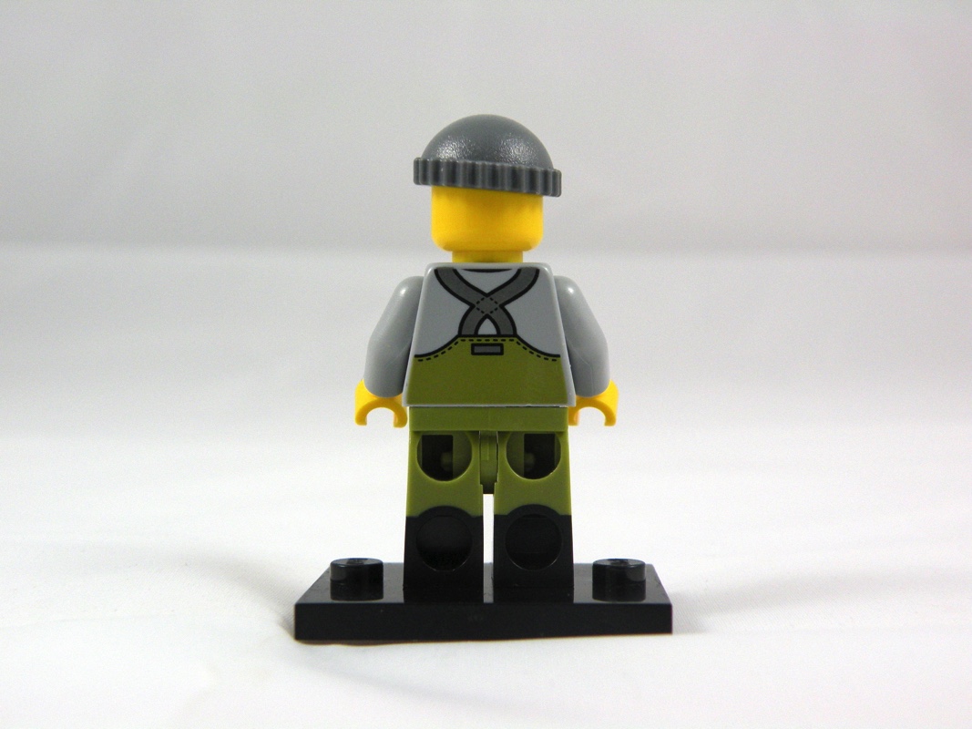 Décidément, que de nouveautés dans les minifigs de ce set ! Ici encore, le torse avec ses bretelles, qui donne sur des cuissardes en olive green, et des bottes en dark blue, jusque là jamais vues non plus. C’est simmple, mais efficace et soigné. Petit regret pour lui, le torse en olive green n’apparaît que sur l’avant et l’arrière, et pas sur les côtés du torse. Le visage présente une barbe, une moustache et des sourcils marrons, encore une nouveauté. Son bonnet gris est par contre relativement courant.