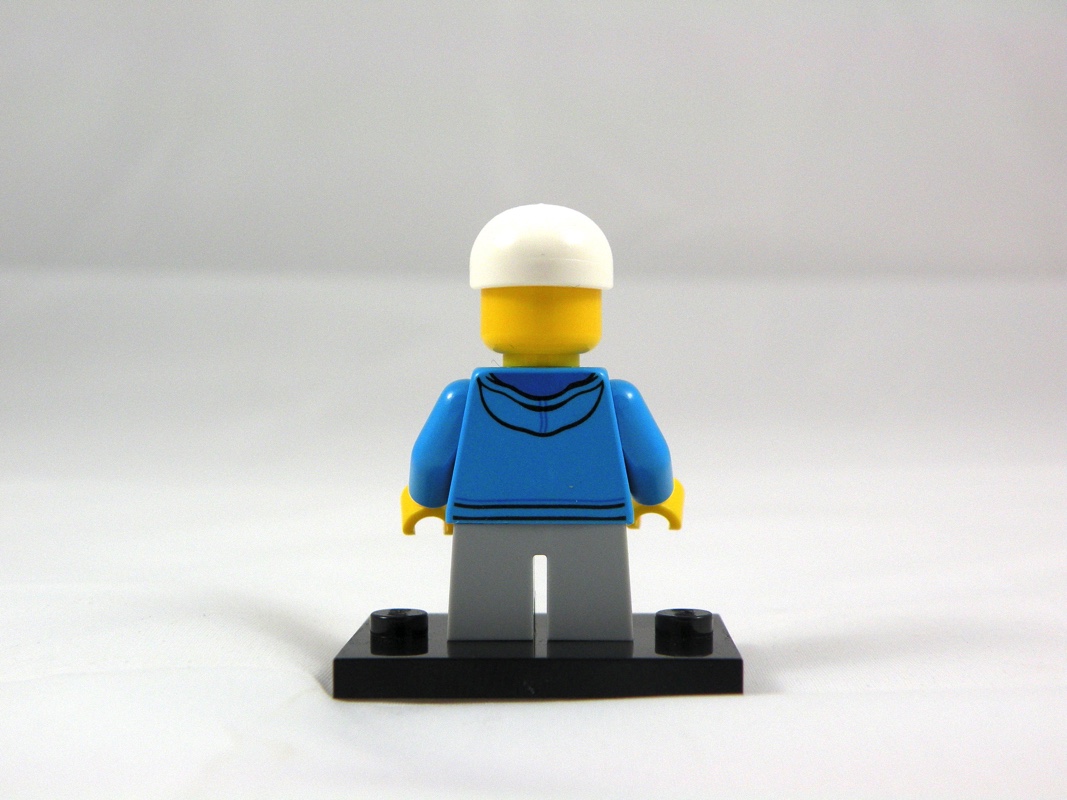 Lui porte un sweat bleu sur un tee-shirt vert rayé, ses jambes sont monochromes, sa tête avec les tâches de rousseur et sa casquette blanche sont des éléments plutôt courants. Dommage que ce dernier n’ait pas bénéficié du soin apporté aux trois autres minifigs.
