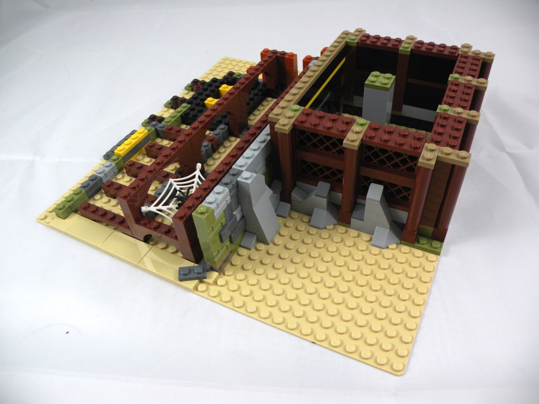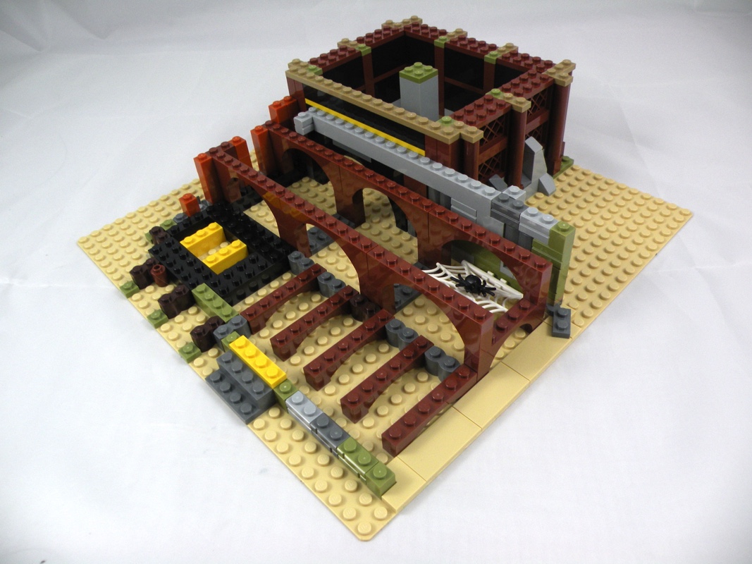 Cette première étape démarre par l’assemblage des 4 minifigs dont nous avons précédemment parlé, avant d’enchaîner sur la construction des « fondations » de notre magasin de pêche. Et on se rend compte dès le départ de l’extrême richesse de l’inventaire qui compose celui-ci, comme par exemple ces Olive Green Brick, Modified 1 x 2 with Masonry Profile (Brick Profile) qui apparaissent dans ce set pour la première fois, ou encore les briques 1×1 de cette même couleur qui n’apparaissent ici que pour la troisième fois. Une des arches qui compose les fondations apparaît également pour la première fois. Je ne vais pas faire l’inventaire de toutes les nouveautés ou raretés, mais vous découvrirez à la construction du set qu’elles sont légion. Une grande toile d’araignée se cache dans les fondations, tandis que la partie basse est composée d’un joli mélange sur sa partie basse de pièces en olive green, light bluish gray et dark bluish gray, formant les rochers et les algues. Les arches sont elles en reddish brown, dark brown, dark tan et olive green également. Autant dire que ça commence très fort, et que le plaisir est au rendez-vous dès les premières étapes de la construction.
