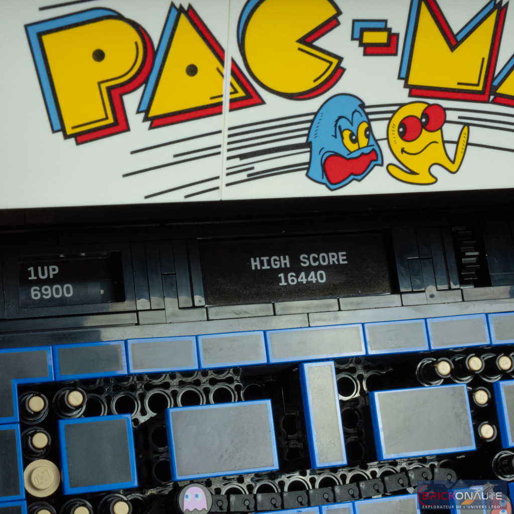 Côté design, le contrat est à mon avis rempli avec une borne d’arcade fidèle à sa grande soeur des années 1980. Les formes sont habilement reproduites avec des techniques d’assemblage qui permettent de retrouver les angles d’origine, et les couleurs des éléments LEGO sont particulièrement bien adaptées à l’esthétique de l’époque.