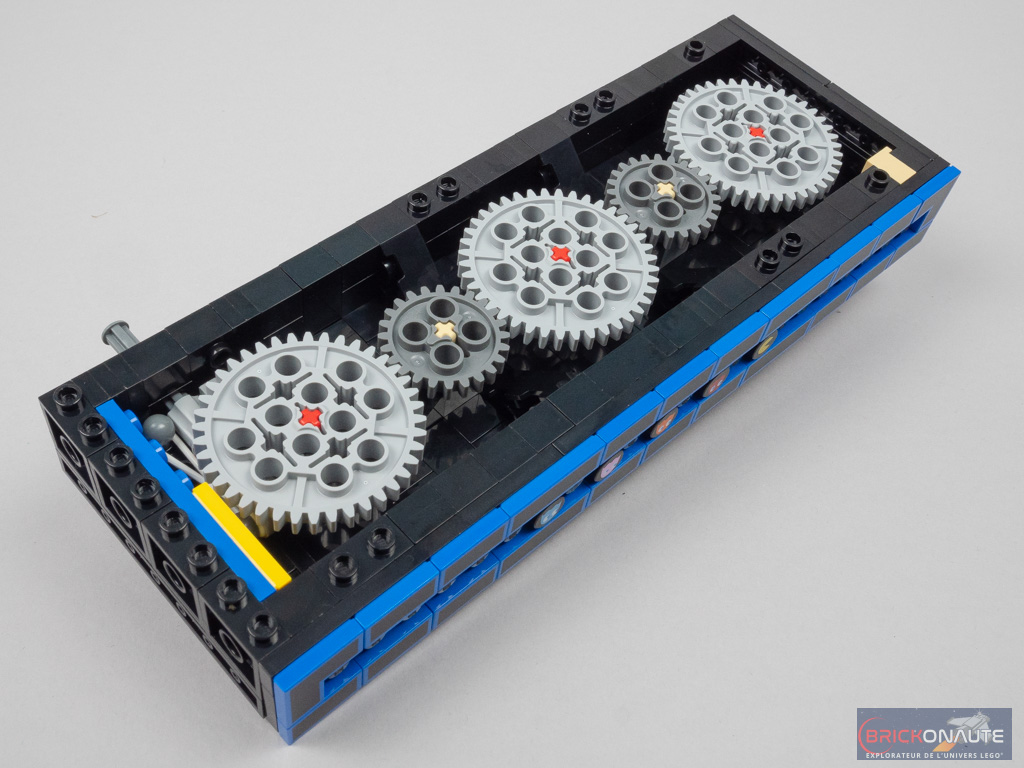 L’étape suivante consiste essentiellement en un empilement de briques sur les côtés de la borne. On y intercale quelques éléments SNOT qui permettront de fixer deux grandes tiles de 8×16 tenons à la verticale. On vient également fixer la manivelle et deux engrenages côté intérieur.