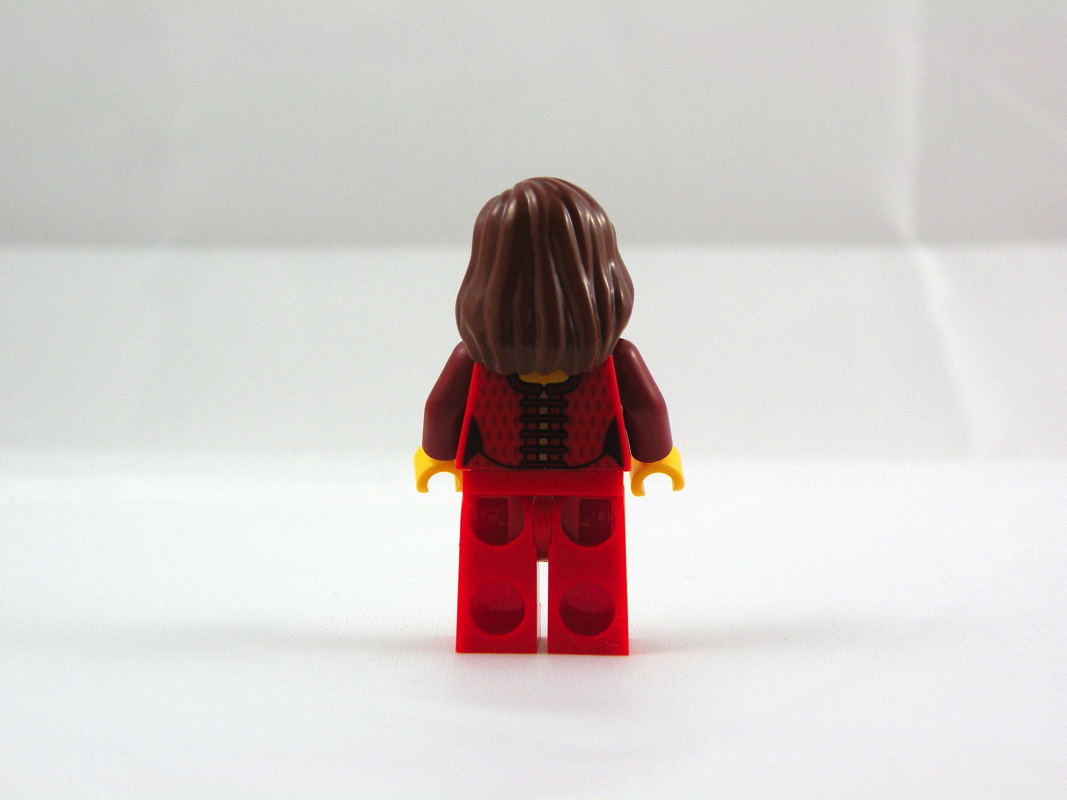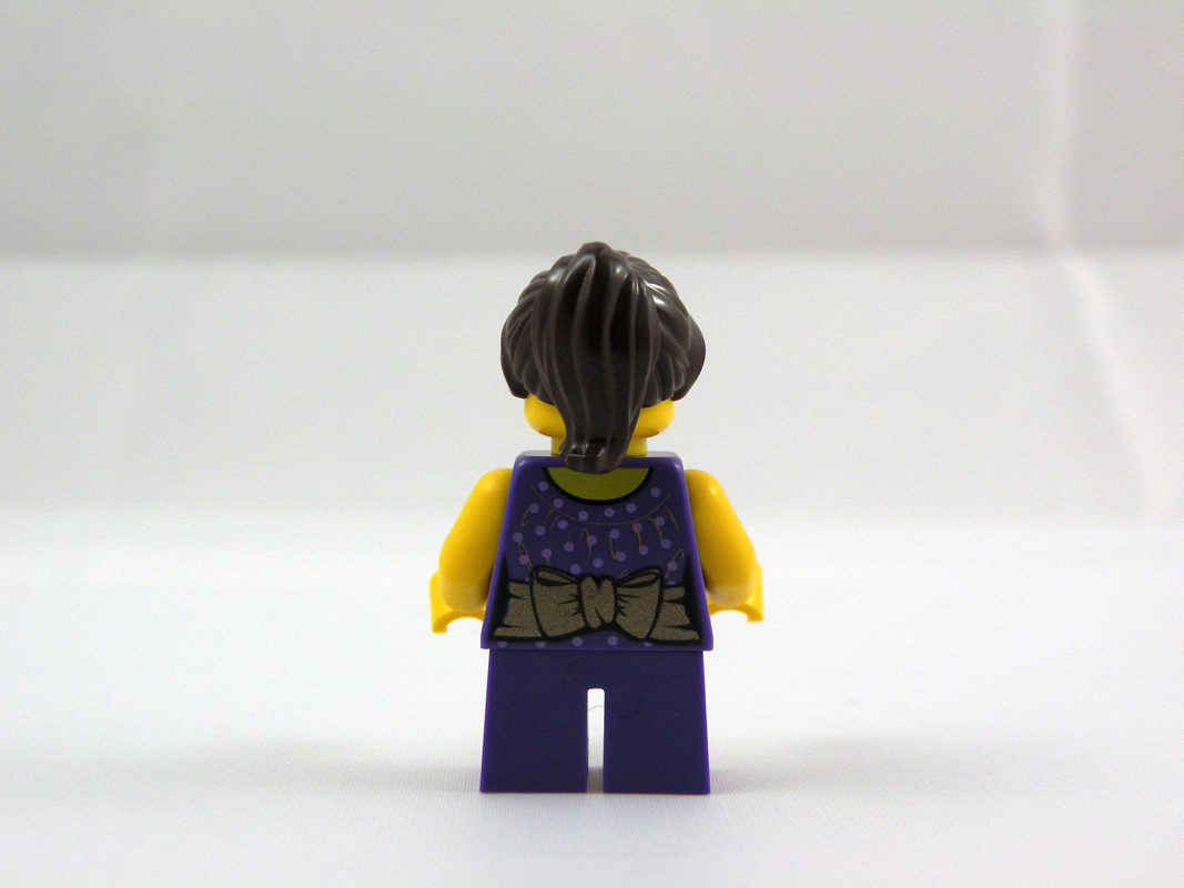 Une chevelure ample qui dépasse sur l’avant du corps, et ce qu’on peut imaginer être une robe de cocktail avec un décolleté (pas trop) généreux (il s’agit de LEGO, n’abusons pas !), l’arrière est également joliment décoré, et les bras sont de couleur différente du reste. Sympathique également.