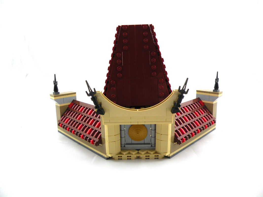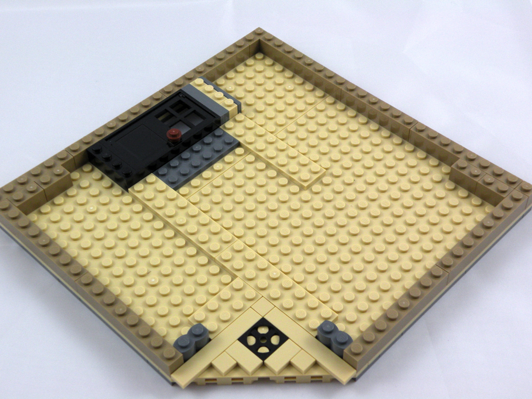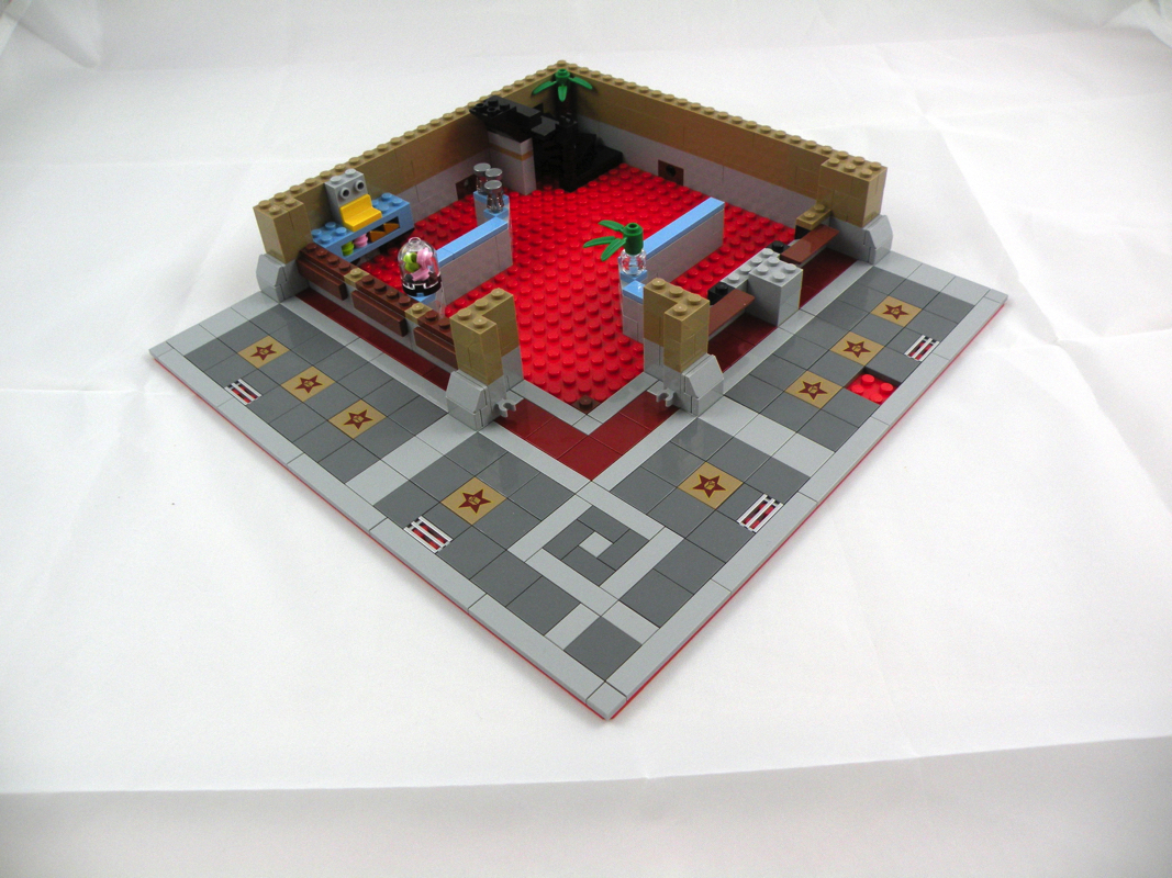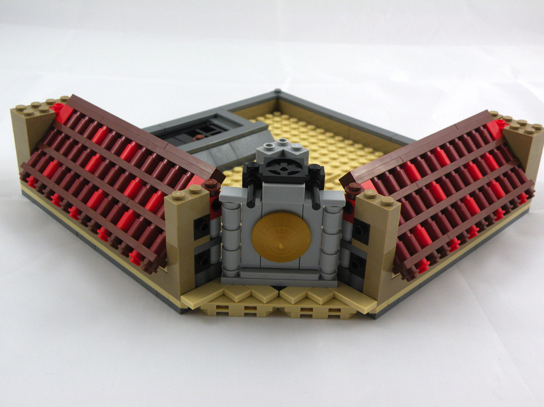 On assemble enfin les deux grandes portes vitrées et leurs poignées dorées, les arches joliment décorées à l’aide de round plates 1×1 en trans yellow, les projecteurs réalisés avec des harpons (!) et enfin les tiles destinées à recevoir le niveau supérieur.