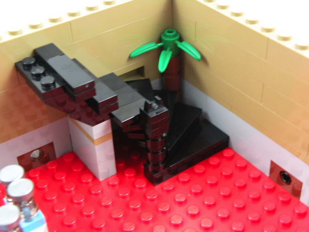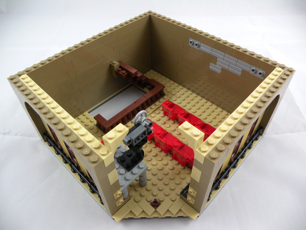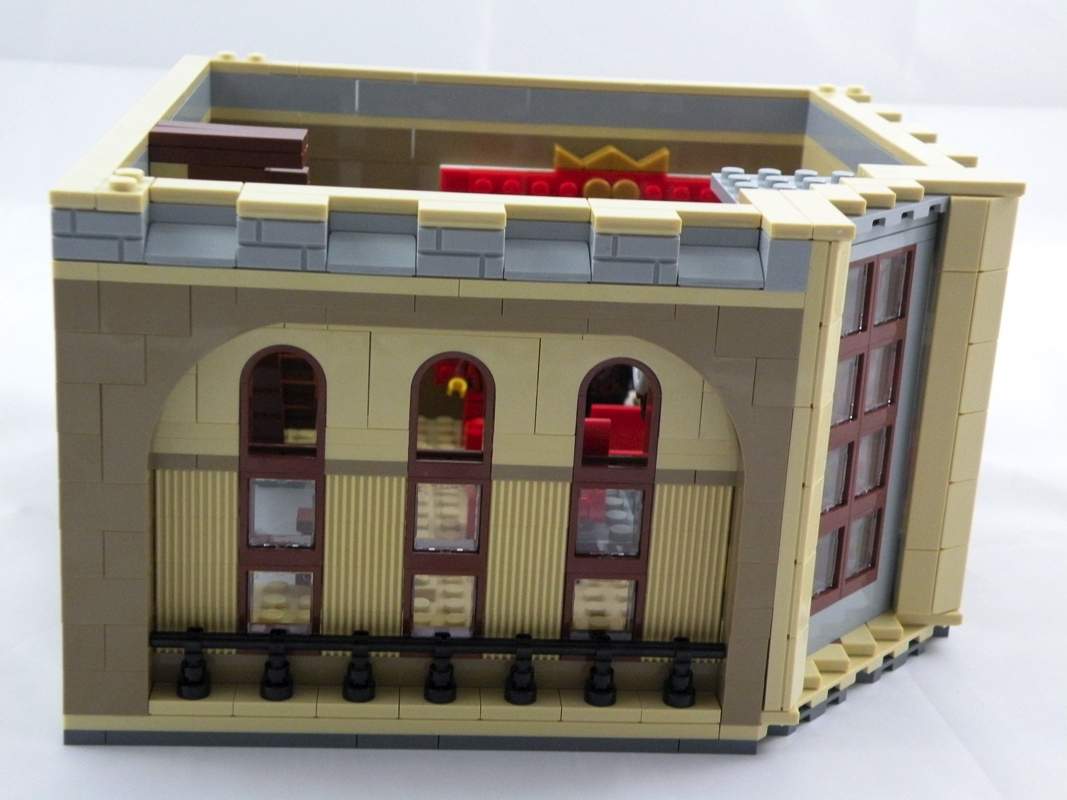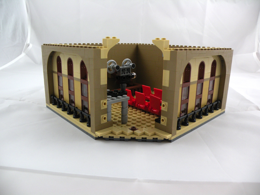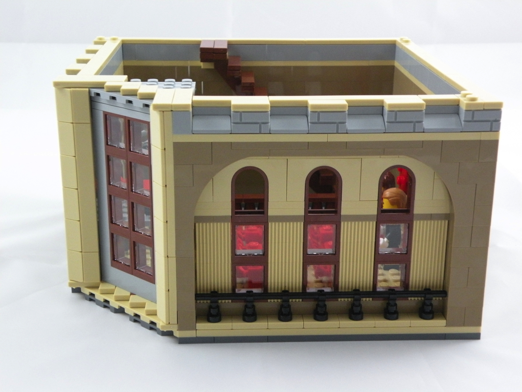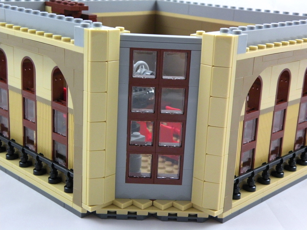 On termine l’assemblage de ce premier étage avec l’assemblage des fenêtres (et notamment une très grande dans l’angle, composée de 8 éléments vitrés), des arches sur l’extérieur en dark tan sur les murs en tan apportant un contraste très intéressant, l’écran de cinéma avec sa scène un peu kitsch (encore un sticker…), et les sempiternelles tiles sur le haut destinées à recevoir le toit.
