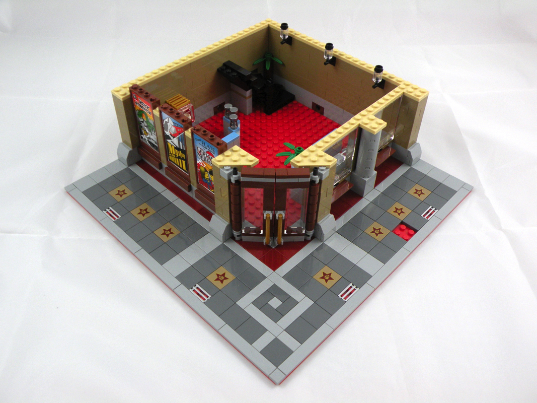 On continue donc logiquement avec l’assemblage du rez de chaussée du cinéma. Et comme les autres sets de la gamme, on commence par réaliser le pavage sur la plaque de base. C’est ici qu’on retrouve les tiles tampographiées d’une brique dorée façon Walk Of Fame. L’extérieur du cinéma est vraiment joli, on regrettera que le sol de l’intérieur du cinéma n’ait pas bénéficié du même traitement, mais on se consolera en se disant qu’il s’agit dans doute d’une moquette rouge uniformément posée sur le sol.