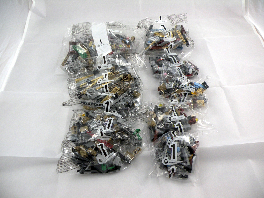 A l’intérieur de la boîte, une plaque de base rouge 32×32 tenons, 2 plates 16×16 et 2 plates 8×16 en tan. Puis 19 sachets de pièces numérotés de 1 à 3, dans le détail 8 sachets 1, 6 sachets 2 et 5 sachets 3. Les premiers serviront à l’assemblage du rez-de-chaussée et de la limousine, la deuxième série au 1er étage, et la dernier au toit et aux petits accessoires annexes.