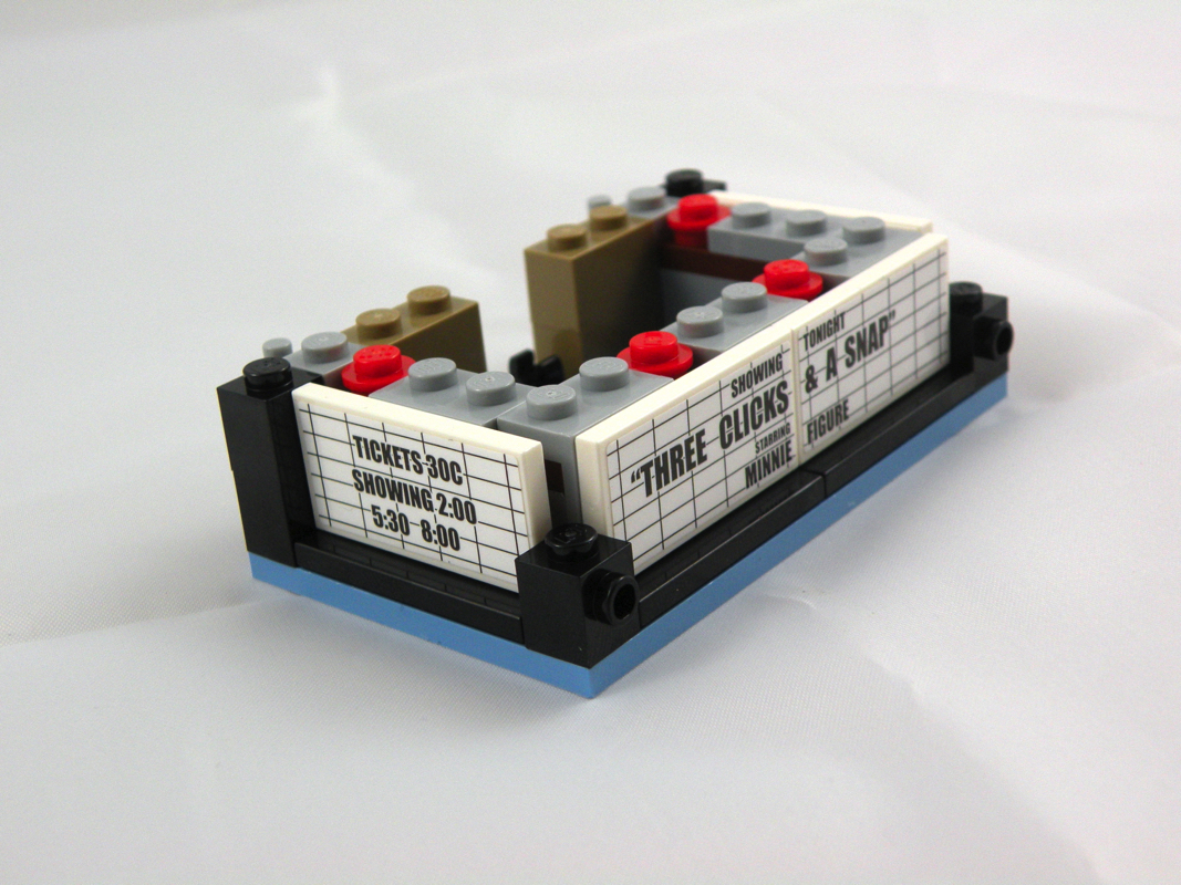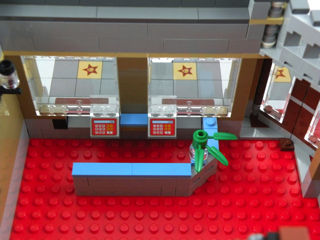 On commence ensuite à monter les murs, puis à aménager l’intérieur avec ses deux comptoirs (pour les caisses et les confiseries). On notera également la réalisation ingénieuse des première marches en colimaçon de l’escalier, aboutissant sur un escalier droit plus classique. Deux slopes tampographiées font office de caisses enregistreuses. Du côté des confiseries, on retrouve une machine à café, des bonbons ou encore une machine à pop-corn. Le choix des couleurs est judicieux, entre le rouge du sol, les murets en light bluish gray, les comptoirs en medium blue et les murs en dark tan. Quelques éléments colorés et notamment des plantes viennent égayer l’ambiance.