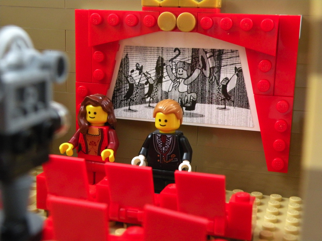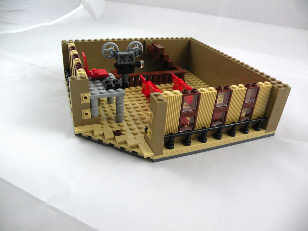 On commence par y assembler les supports des futurs sièges, ainsi que la rambarde de l’escalier venant du rez-de-chaussée. On construit ensuite les sièges rouges (qui sont inclinables à l’envi), le support accueillant le projecteur et le fauteuil du projectionniste, et l’amorce de l’escalier. Evidemment, on continue de monter les rangs de murs dans le même temps.