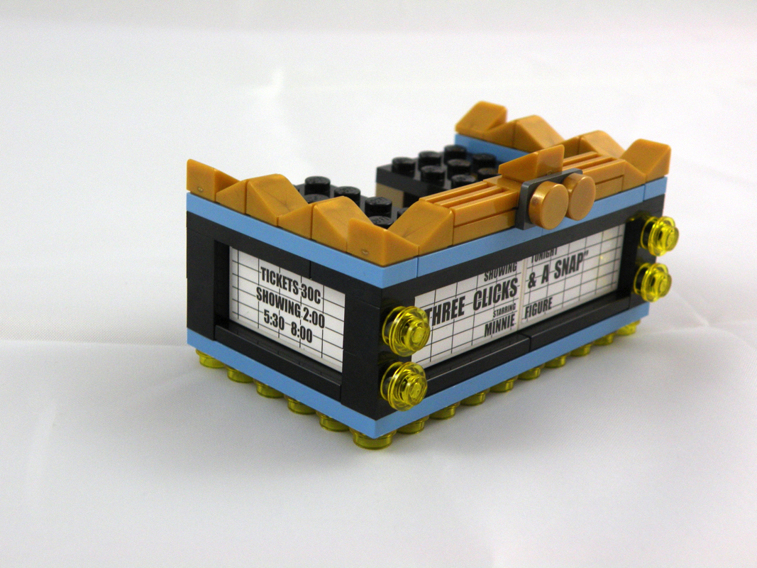 C’est l’avant-dernière étape, et pour moi l’une de celles apportant la plus grande satisfaction. On commence par la base de l’enseigne avec (encore) des stickers, cette fois-ci pour le tarif des entrées et le spectacle du moment. Mais c’est surtout la suite qui est intéressante. Les lettres composant le mot « Palace » sont obtenues par la superposition de bricks et plates en blanc et en medium blue, le trou du « a » étant même réalisé avec une brique technic. On décore enfin l’ensemble à l’aide de round plates 1×1 en trans yellow. L’ensemble vient se fixer sur les clips laissés en attente au dessus des portes du rez-de-chaussée.