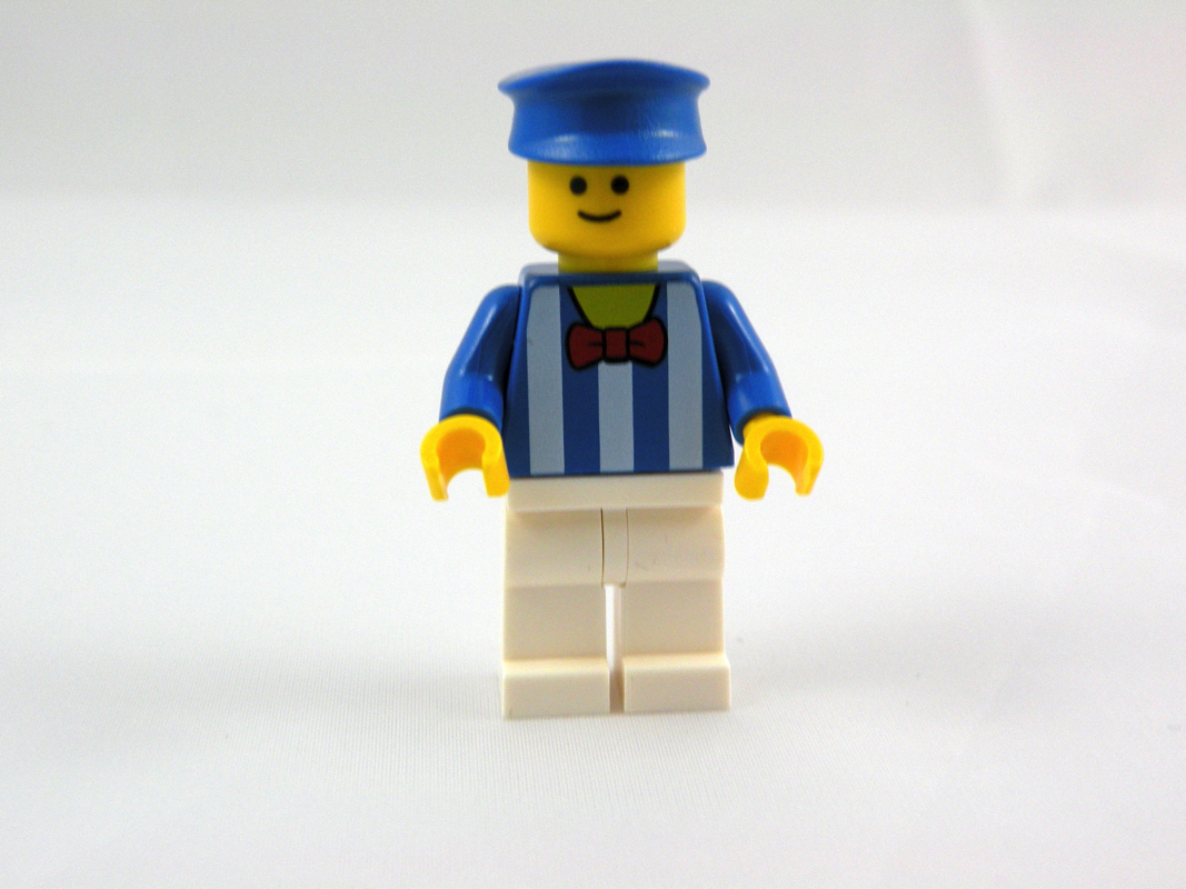 Traitement très (trop ?) simple ici, une veste à rayures bleue et blanche, une casquette bleue et un pantalon monochrome blanc.