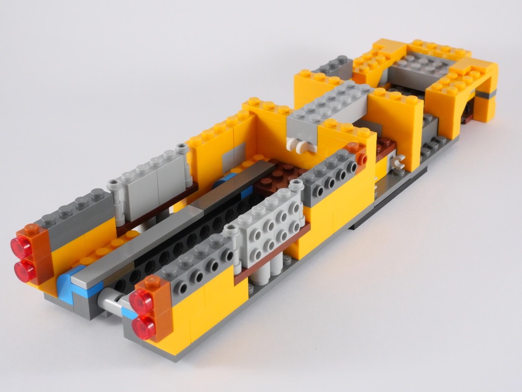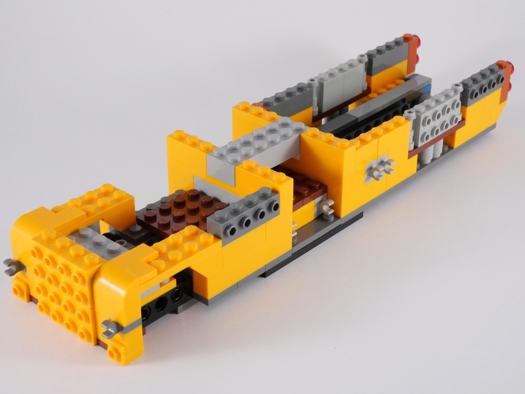Le troisième sachet de pièces démarre avec l’ajout de quelques éléments sur le capot, et la construction du poste de conduite plutôt rudimentaire. On construit alors 2 rangées de fenêtres à l’arrière. La partie intermédiaire, entre le poste de conduite et le centre de commande est vide, à l’exception d’une brique passant au travers dont on ne sait pas trop bien ce qu’elle fait là. On rigidifie l’ensemble avec quelques plates, puis on ajoute le pare-brise et la porte d’accès au poste de conduite.