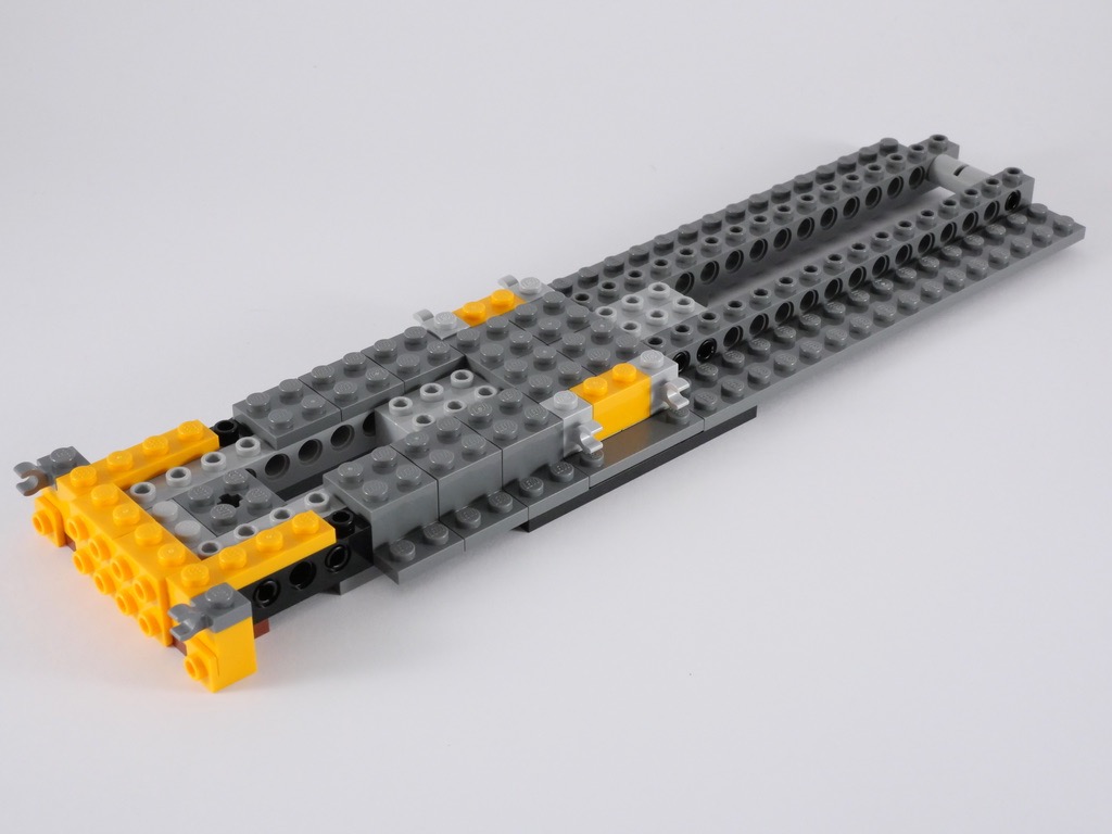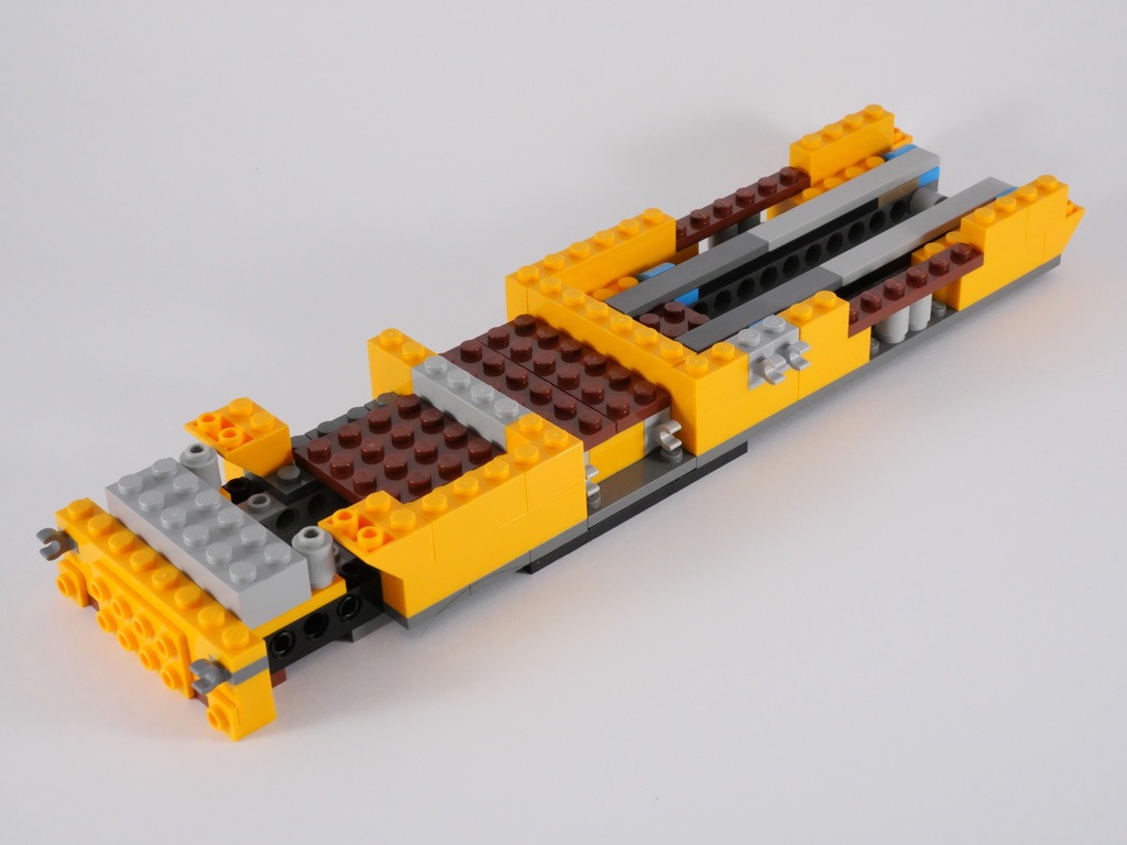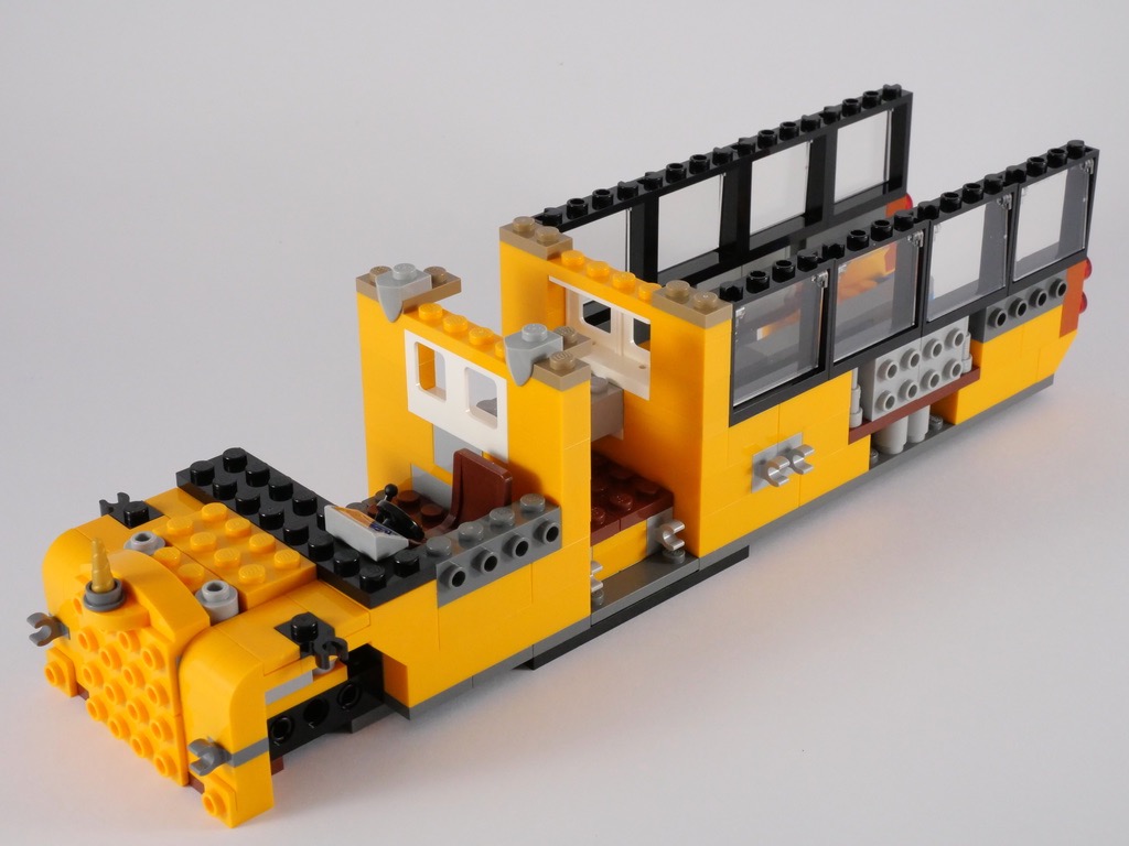 On passe alors au bus proprement dit, qui commence par une structure à base de pièces Technic apportant une rigidité suffisante pour le manipuler. On ajoute une partie du pare-chocs avant, les bas de caisse, puis les éléments constituant le plancher. Des tiles sont installées à l’arrière afin de pouvoir y insérer le centre de commande préalablement construit. On superpose quelques briques pour constituer les côtés.