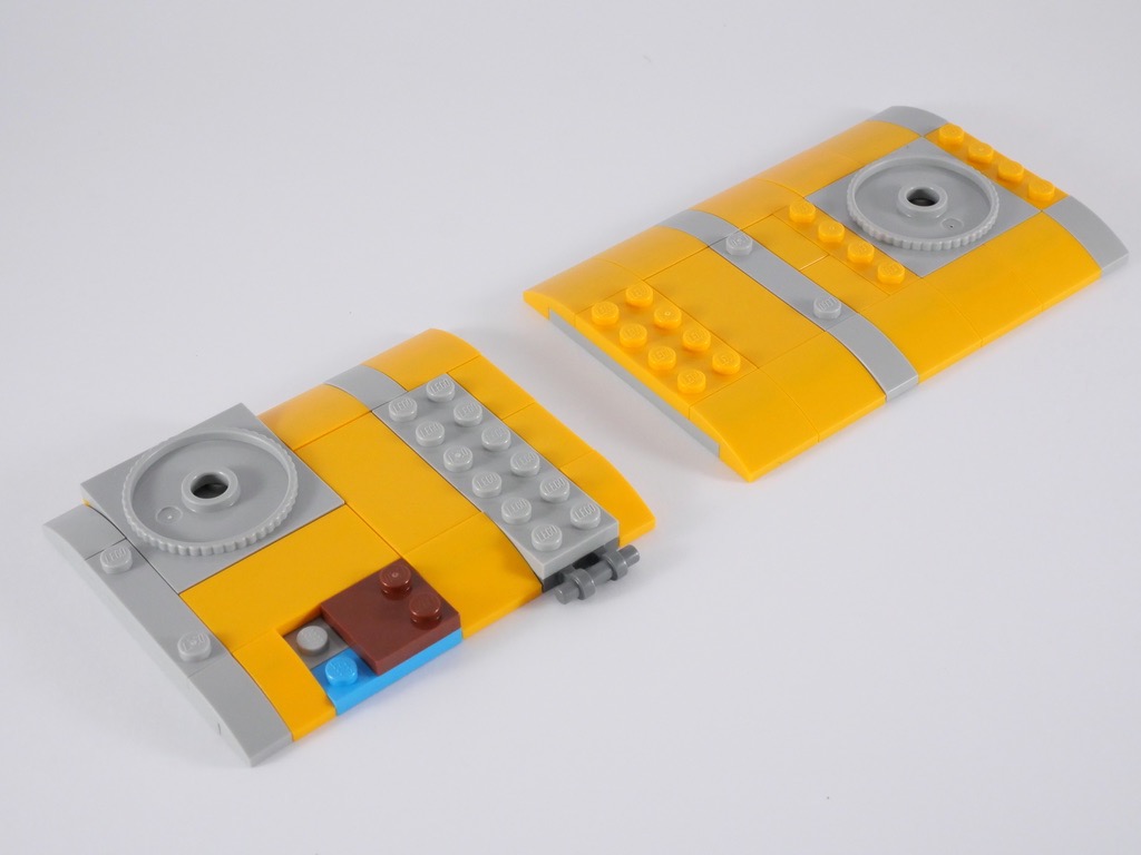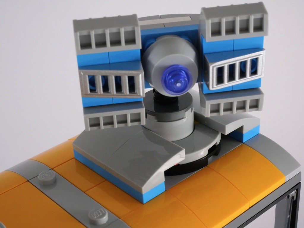 On passe alors au cinquième et dernier sachet de pièces, qui se concentre sur l’ajout d’éléments de jouabilité. On commence par un radar, dont le socle coloré sert de sélecteur dans l’application pour smartphone. On continue avec un canon, dont une partie rotative permet également d’interagir avec l’appli. On termine le bus avec les deux portes venant de chaque côté de la partie centrale du bus, toutes deux armées de canons et de slopes colorées pour, vous l’aurez deviné, jouer avec l’appli. Comme tout véhicule qui se respecte, on achève le modèle en lui fixant ses 4 roues aux moyeux rouges.