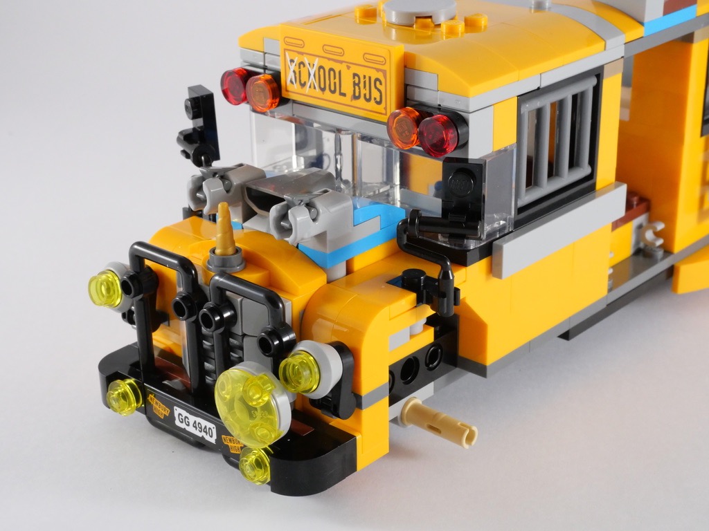 Le design est original et, à vrai dire, plutôt réussi. Le « mix » entre le bus scolaire américain jaune et son équipement de chasse aux fantômes est convaincant. L’aspect « je te rajoute un canon puis un autre puis un poste de commande puis une échelle » sur la base d’un bus standard nous plonge dans une ambiance post-apocalyptique : le monde est désormais contrôlé par les fantômes, et il faut faire avec les moyens du bord pour les combattre. Le modèle regorge de petits détails, jusqu’à intégrer des easter eggs en référence à d’autres sets. Le choix des couleurs est sans doute intimement lié aux fonctionnalités offertes par l’appli. J’aurais aimé retrouver quelques couleurs plus sombres, notamment au niveau des portes latérales, un peu trop flashy à mon goût.