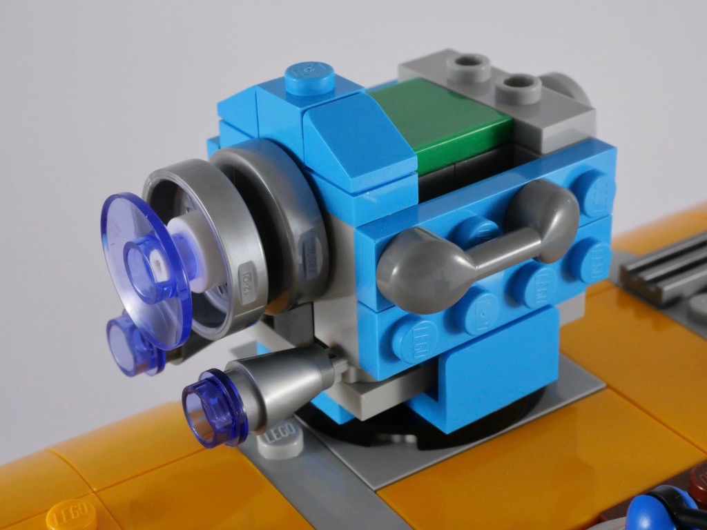 On passe alors au bus, et plus précisément au centre de commande qui se situe à l’intérieur. Sur une grande base grise, on ajoute un ordinateur avec ses deux écrans, sa souris, son clavier et un siège. On construit également un bureau avec un microscope, et un lit pour les missions prolongées. C’est sympa, et facilement accessible une fois le modèle construit : il suffit de tirer le tout depuis l’arrière du bus.