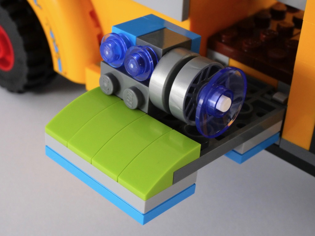 Pas de vitre côté gauche : ce sont des barreaux. On termine de décorer le capot avant de construire une partie du toit, qui dispose d’une turntable afin d’y fixer les équipements de chasse aux fantômes. Un second élément de toit est construit sur le même principe. On termine ce sachet de pièces avec l’ajout de stud shooters à l’avant du bus, des rétroviseurs et de quelques tiles sur le côté.