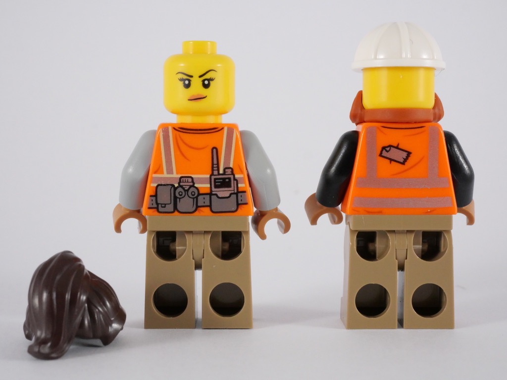 Les deux autres minifigs sont en revanche, du moins pour le moment, exclusives à ce set. Leur pantalon est identique, on y trouve quelques tâches de terre, les poches et la ceinture. Leur torse diffère : sous leur gilet haute-visibilité, Nanna porte un tee-shirt décoré du logo Blacktron, celui de Bill arborant un crocodile. Le dos diffère également : Nanna porte une ceinture pleine d’outils. Nanna dispose d’une expression de visage alternative, ce n’est pas le cas de Bill (à cause de son casque). C’est très finement réalisé.