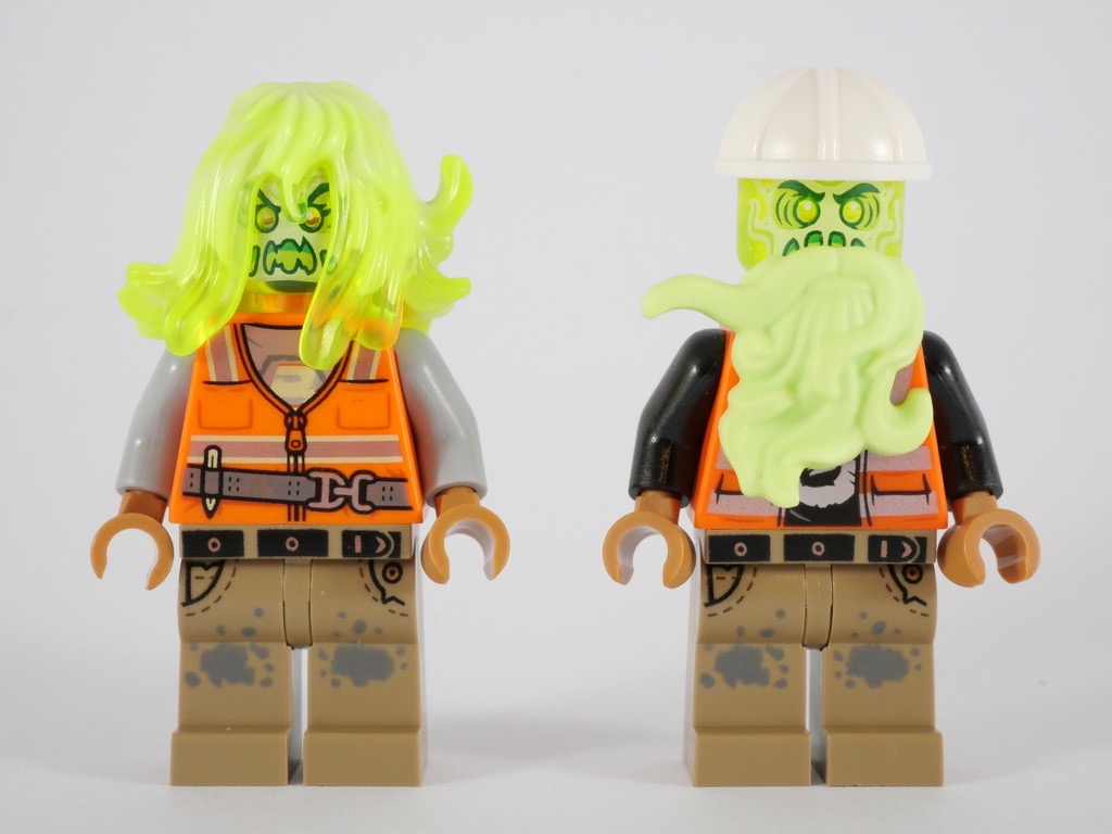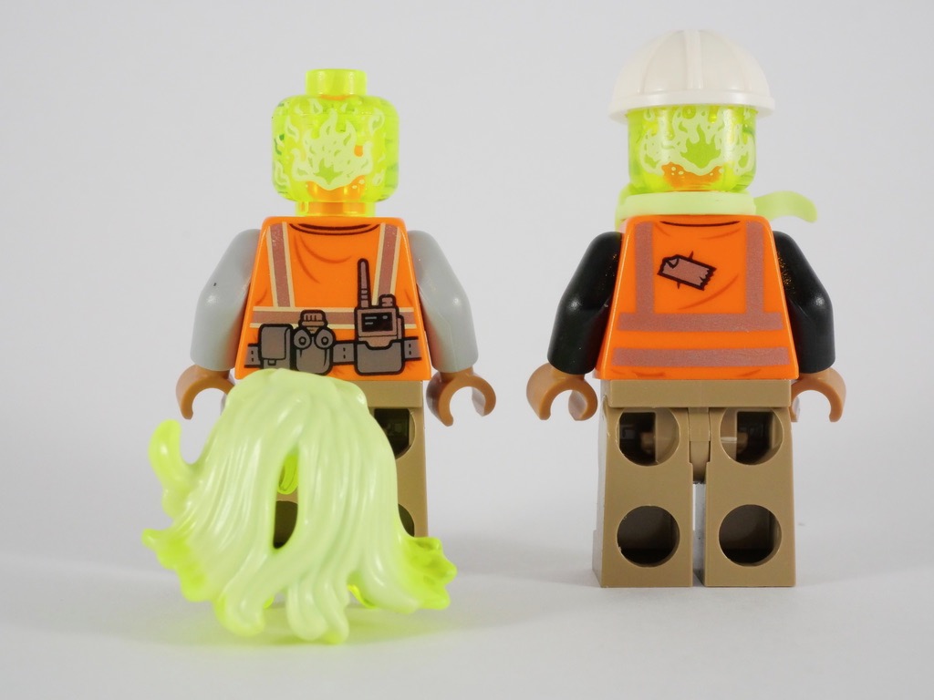 LEGO nous livre de quoi tranformer ces deux personnages en fantômes, et c’est également très bien réalisé. La barbe rousse de Bill prend une couleur yellowish green, comme les cheveux de sa collègue où cette couleur est mixée avec du trans neon green. Les têtes des personnages sont également de cette couleur et revêtent des expressions menaçantes. Un bon point pour cette transformation des deux innocents ouvriers en démons possédés, ça fonctionne bien.