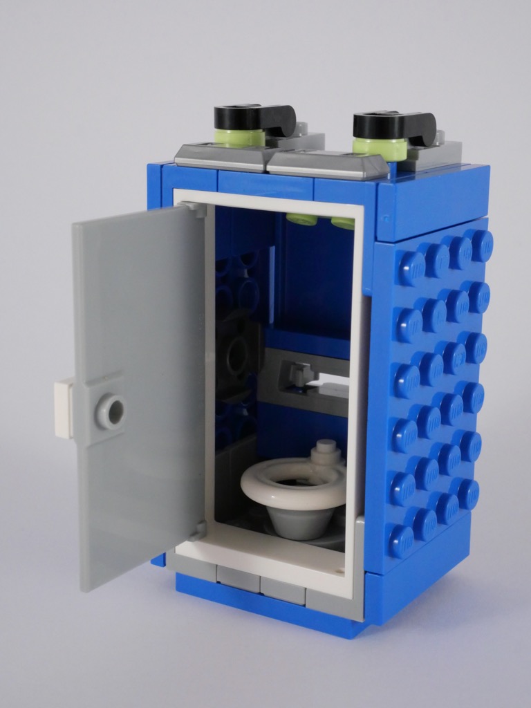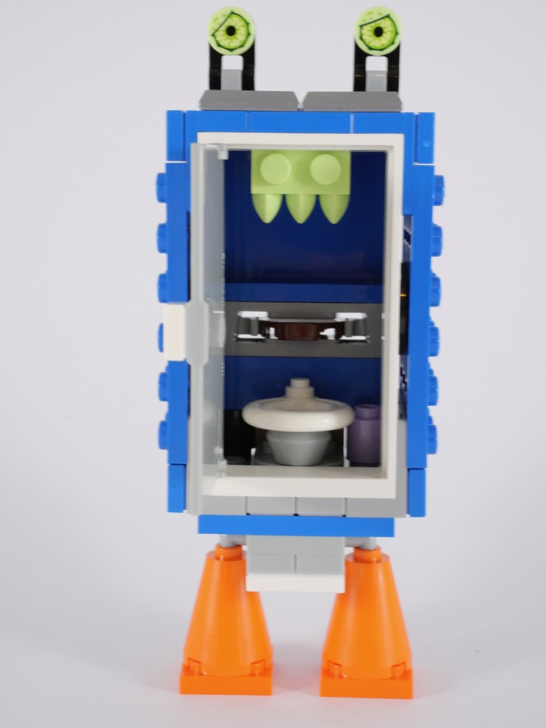 La construction commence avec l’assemblage des toilettes de chantier. On y ajoute de quoi en faire un monstre : une paire d’yeux, et quelques dents à déployer dans la partie supérieure. En y fixant le panneau de chantier et les cônes en guise de jambes, nous avons un monstre tout à fait convenable. Il est possible d’en éjecter des disques marrons. C’est plutôt basique, mais c’est réussi. Le designer a même pris le soin d’intégrer le rouleau de papier toilette.