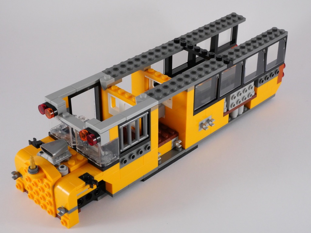 On passe alors au bus proprement dit, qui commence par une structure à base de pièces Technic apportant une rigidité suffisante pour le manipuler. On ajoute une partie du pare-chocs avant, les bas de caisse, puis les éléments constituant le plancher. Des tiles sont installées à l’arrière afin de pouvoir y insérer le centre de commande préalablement construit. On superpose quelques briques pour constituer les côtés.