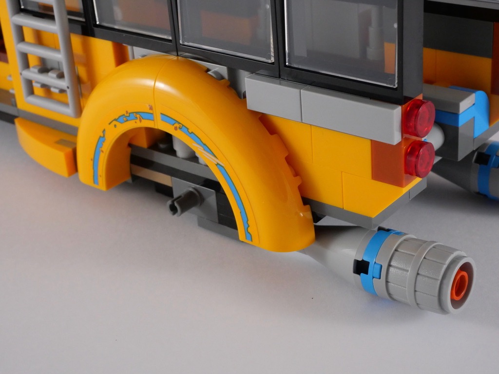 Le design est original et, à vrai dire, plutôt réussi. Le « mix » entre le bus scolaire américain jaune et son équipement de chasse aux fantômes est convaincant. L’aspect « je te rajoute un canon puis un autre puis un poste de commande puis une échelle » sur la base d’un bus standard nous plonge dans une ambiance post-apocalyptique : le monde est désormais contrôlé par les fantômes, et il faut faire avec les moyens du bord pour les combattre. Le modèle regorge de petits détails, jusqu’à intégrer des easter eggs en référence à d’autres sets. Le choix des couleurs est sans doute intimement lié aux fonctionnalités offertes par l’appli. J’aurais aimé retrouver quelques couleurs plus sombres, notamment au niveau des portes latérales, un peu trop flashy à mon goût.