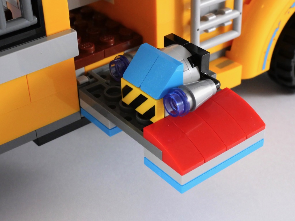 On passe alors au bus, et plus précisément au centre de commande qui se situe à l’intérieur. Sur une grande base grise, on ajoute un ordinateur avec ses deux écrans, sa souris, son clavier et un siège. On construit également un bureau avec un microscope, et un lit pour les missions prolongées. C’est sympa, et facilement accessible une fois le modèle construit : il suffit de tirer le tout depuis l’arrière du bus.