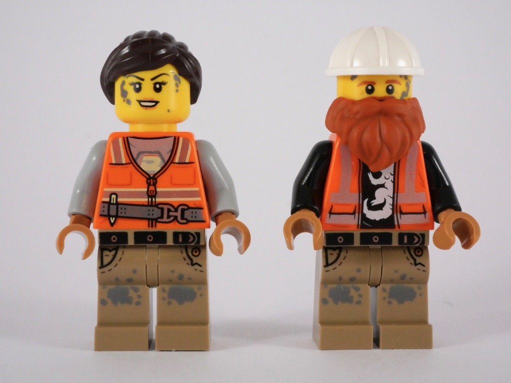 Les deux autres minifigs sont en revanche, du moins pour le moment, exclusives à ce set. Leur pantalon est identique, on y trouve quelques tâches de terre, les poches et la ceinture. Leur torse diffère : sous leur gilet haute-visibilité, Nanna porte un tee-shirt décoré du logo Blacktron, celui de Bill arborant un crocodile. Le dos diffère également : Nanna porte une ceinture pleine d’outils. Nanna dispose d’une expression de visage alternative, ce n’est pas le cas de Bill (à cause de son casque). C’est très finement réalisé.