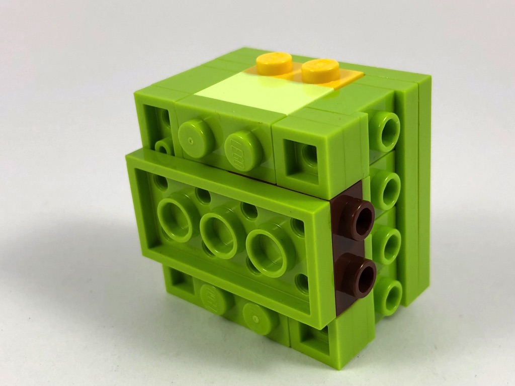 La construction de Bouffe-Tout est plus intéressante. On pouvait s’en douter : la forme particulière du fantôme nécessite quelques techniques bien pensées pour donner une forme arrondie au bas du « corps » de l’ectoplasme. Grâce à un assemblage astucieux de Brick, Modified 1 x 1 with Headlight, décalées d’un quart de tour les unes par rapport aux autres, on dispose de tenons sur la partie inférieure du corps.