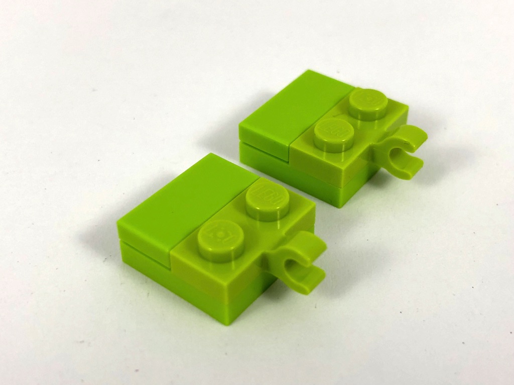 - 2 Lime Plate, Modified 1 x 2 with Clip Horizontal on Side, exclusives