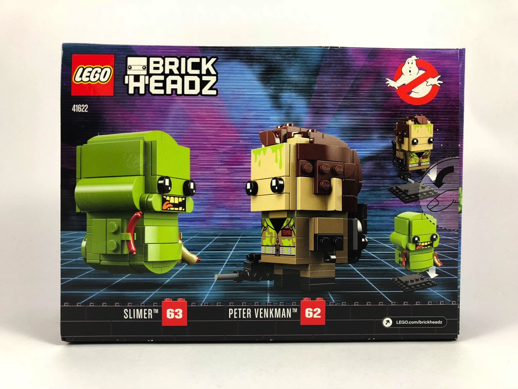 On retrouve sur l’avant de la boîte nos deux BrickHeadz vues de face, Bouffe-Tout semblant flotter au-dessus du sol. Le sol fait d’ailleurs un peu penser à la Grid du film Tron, c’est assez étrange. Le logo SOS Fantômes est en bas à gauche, et au dessous de chacun des personnages nous trouvons leurs noms et leurs numéros dans la gamme LEGO BrickHeadz : 62 pour Peter Venkman, et 63 pour Slimer. Au dos, les deux personnages se font face, et sur le côté droit ils sont présentés au-dessus de leurs socles d’exposition.