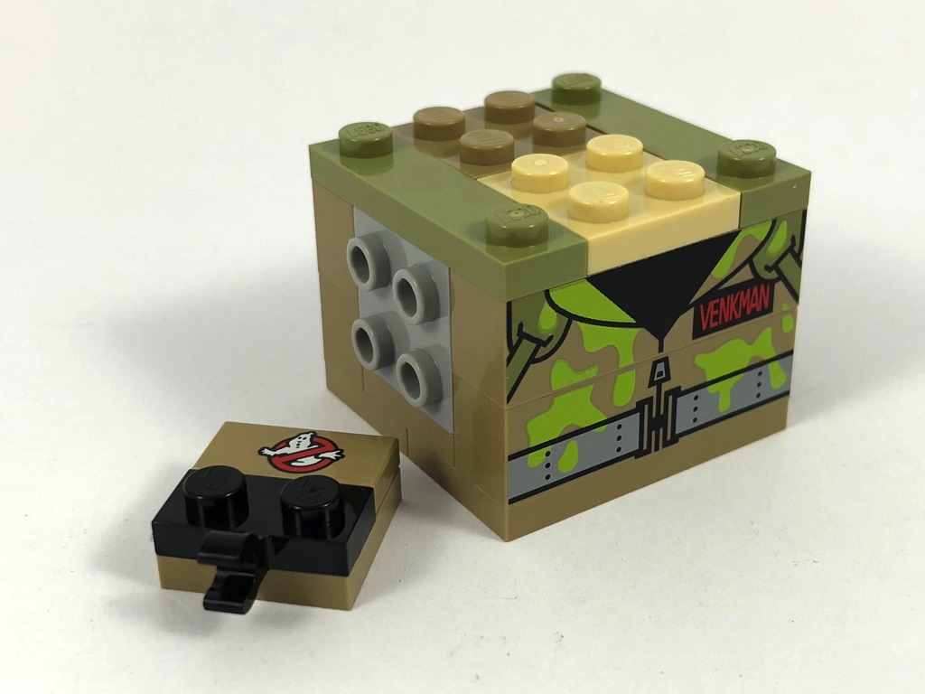La construction de Peter Venkman est assez classique pour une BrickHeadz. On commence par le torse, qui dispose de briques SNOT sur 3 faces, et de deux briques tampographiées sur la quatrième. Les bras sont classiques, à ceci près que le symbole des Ghostbusters est tampographié sur l’épaule droite. La structure interne de la tête est également « standard », avec ses 12 briques SNOT que l’on habille une face après l’autre. Le slime qui dégouline sur le front est bien réalisé, on notera également des plates couleur tan sur la partie haute du crâne montrant le front un peu dégarni du personnage incarné par Bill Murray. La partie la plus intéressante est sans doute la réalisation de son arme, un aspirateur à fantômes. Fixée dans son dos, elle est décorée d’une tile tampographiée. Un fouet la relie à l’aspirateur qu’il tient dans la main.