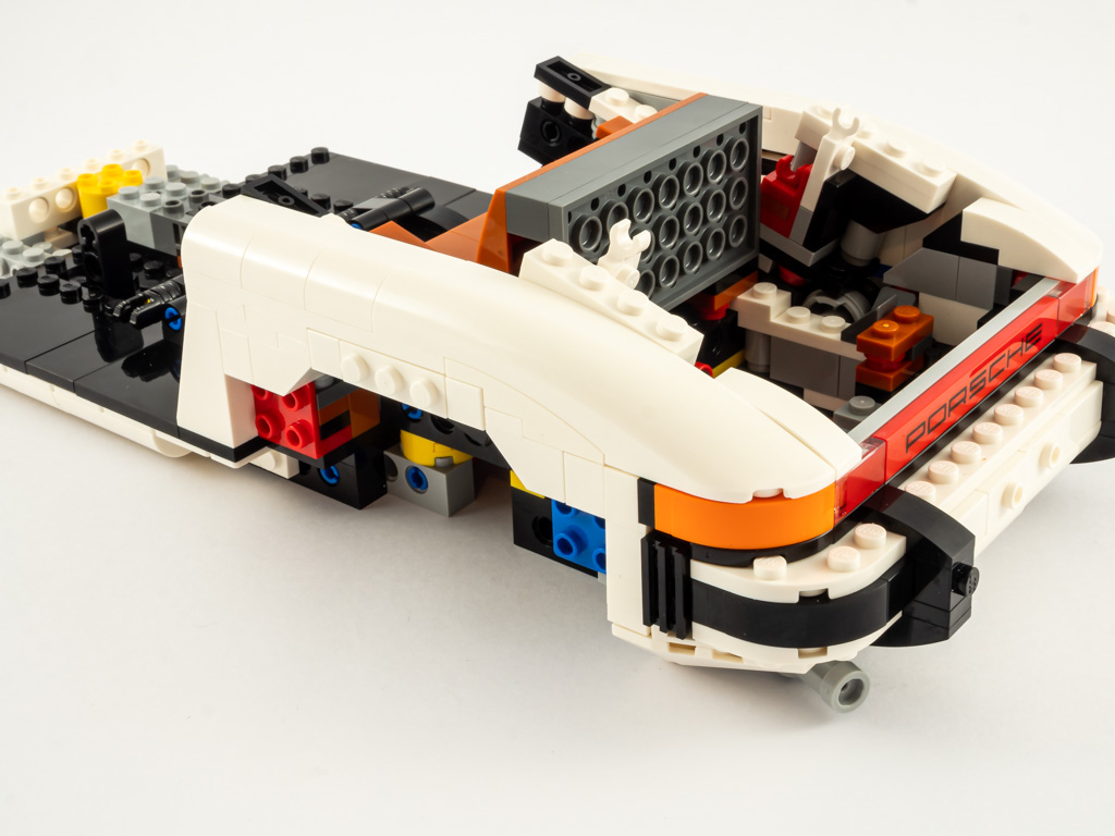Et le set qui nous intéresse aujourd’hui ne fait pas exception à la règle : c’est encore une franche réussite. Même si ce n’est pas parfait : on regrettera par exemple le pare-brise un peu plat (qui aurait certainement mérité une pièce spéciale), ou la lunette arrière imparfaite de la version Targa. Ou encore les écarts de teinte récurrents entre certaines pièces, heureusement assez peu visibles ici. Mais globalement, les proportions sont bonnes et on retrouve tout ce qui fait qu’une Porsche est une Porsche, ces machines étant identifiables au premier coup d’oeil.