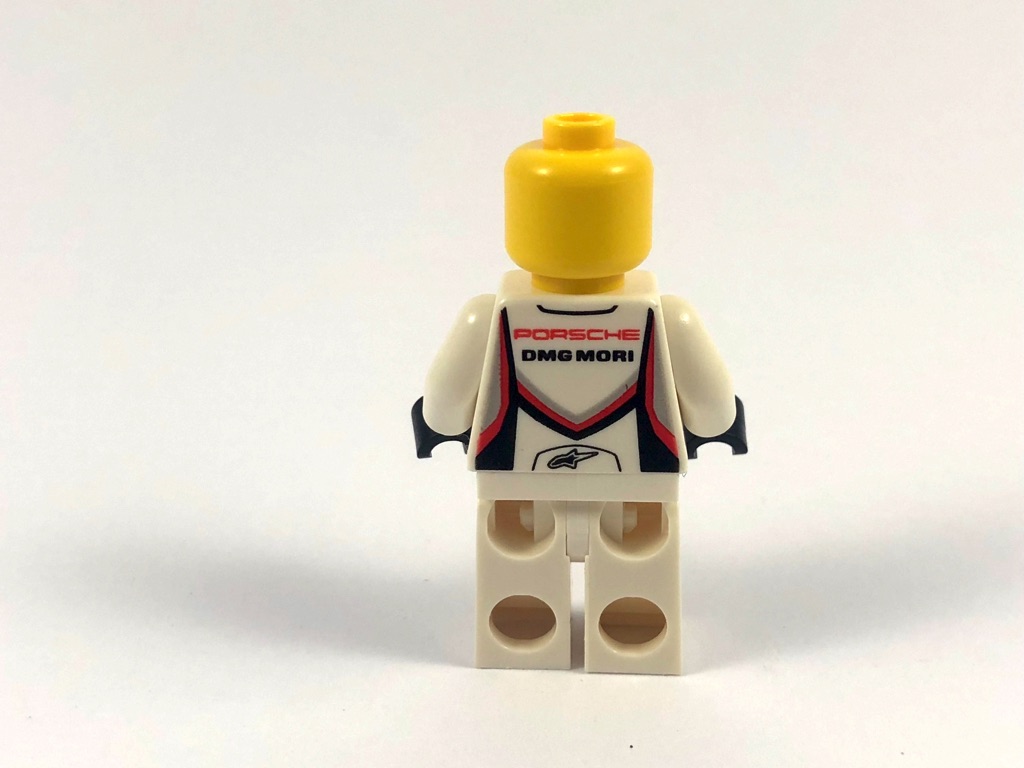 Comme d’habitude, nous trouvons dans ce set le pilote / mécano de la voiture en question. Il porte un pantalon blanc monochrome, et une veste avec ses différents sponsors, dont DMG Mori, WEC ou encore Mobil 1. Dans le dos, on trouve le logo de la marque de la veste (Alpinestars), la marque Porsche, et de nouveau le sponsor DMG Mori. C’est fin et plutôt bien réalisé, mais ça manque cruellement de détails sur le pantalon et les manches, comme d’habitude. Rien de particulier à signaler pour la tête, qu’on retrouve régulièrement (41 sets jusqu’ici), ni pour les accessoires, une clé plate et un casque rouge monochrome.