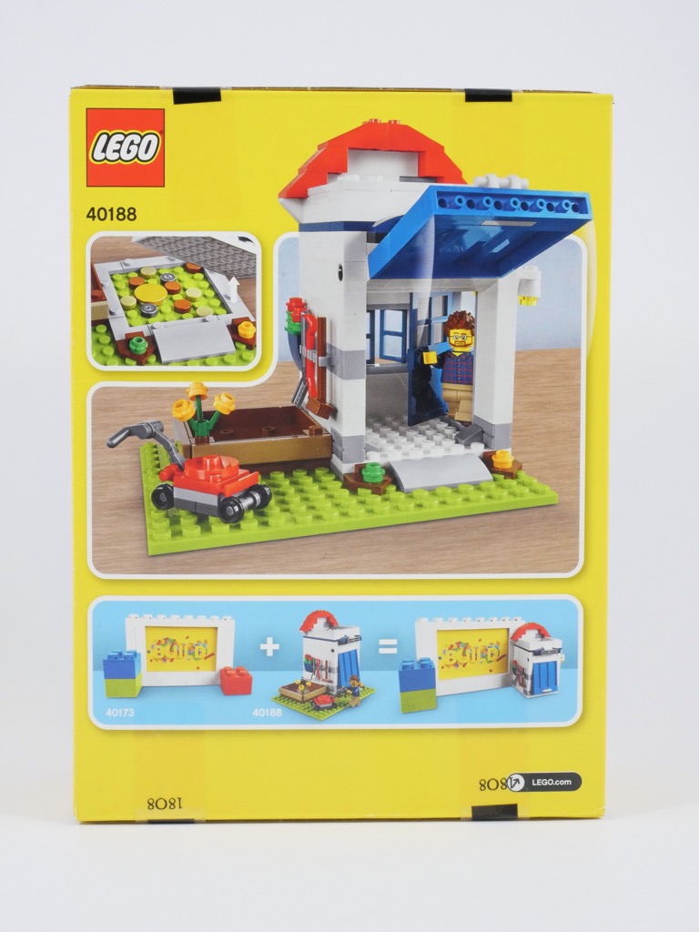 On laisse alors notre base de côté pour construire la maison. Rien de très compliqué ici : on se borne dans un premier temps à une superposition de briques dans lesquelles sont insérées une porte, une fenêtre et une porte de garage articulée sur des pins Technic. On termine avec une portion de toiture (il faut bien garder de la place pour les crayons !) et quelques décorations sur la façade et au-dessus des portes. Il ne reste qu’à mettre notre jardinier aux commandes de sa tondeuse.