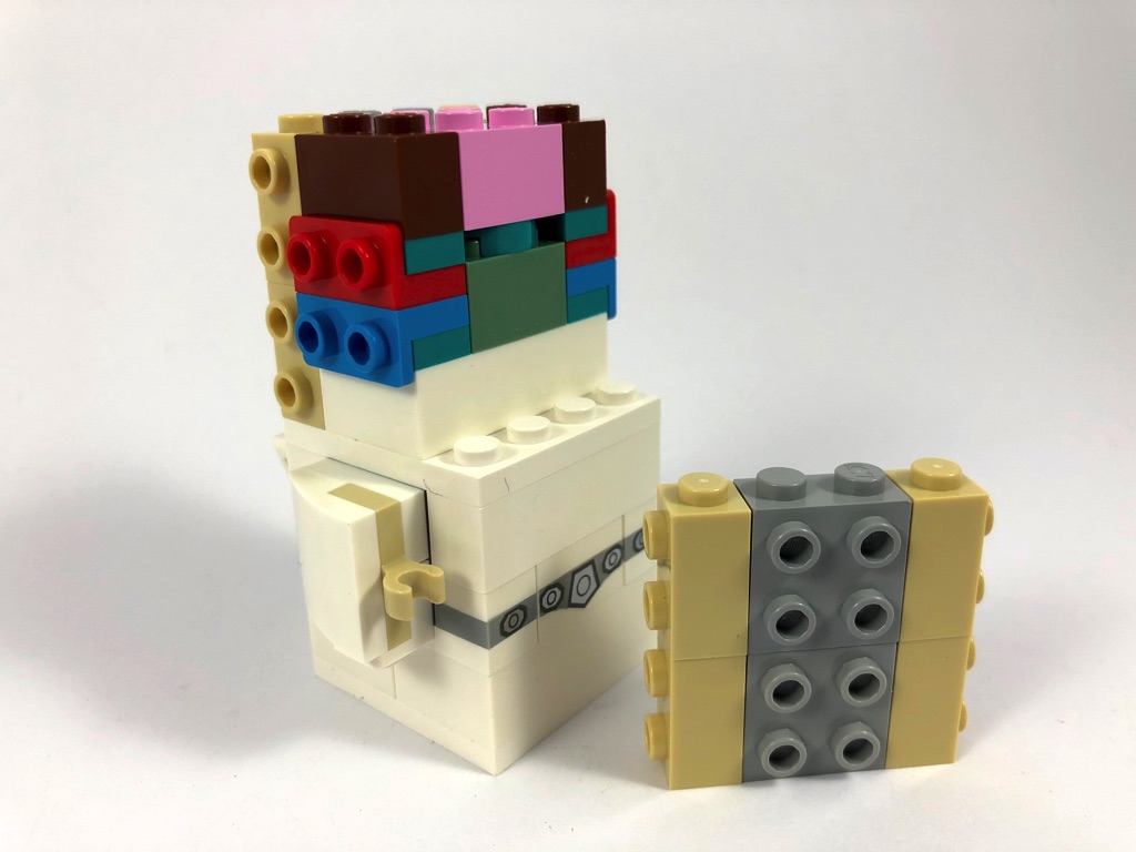Cela en vous aura pas échappé : Leia porte une robe. En ce sens, la construction diffère légèrement puisque l’ensemble torse / jambes est (presque) monobloc, et on commence par celui-ci. Des briques SNOT sont présentes également dans le dos afin d’y représenter les plis de la robe. On notera l’utilisation de plates tampographiées, plutôt rares, pour assurer la continuité de la ceinture.