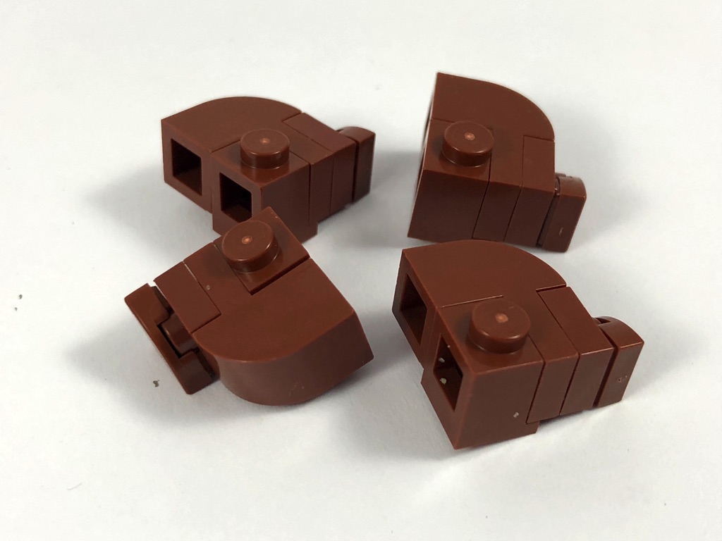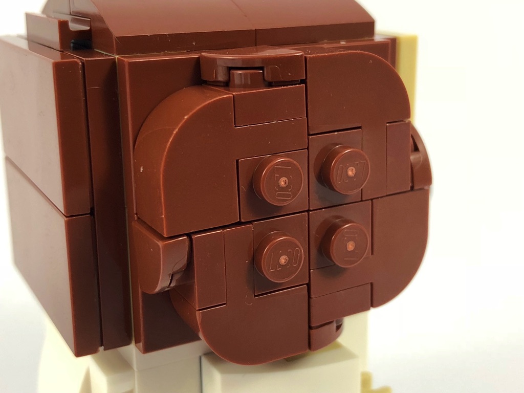 L’intérieur de la tête diffère également des habitudes, la faute à la coiffure si particulière de la princesse. On habille ensuite la tête, à commencer par le haut, puis la face, (très) classiques. Vous vous en doutiez, ce sont les côtés qui sont nettement plus intéressants : tous deux sont composés de 4 sous assemblages en reddish brown, décalés d’un quart de tour entre eux, pour reproduire les fameux buns si caractéristiques. L’arrière est désespérément plat, on termine la princesse en ajoutant deux (mini) jambes et en lui donnant un blaster plutôt rudimentaire.