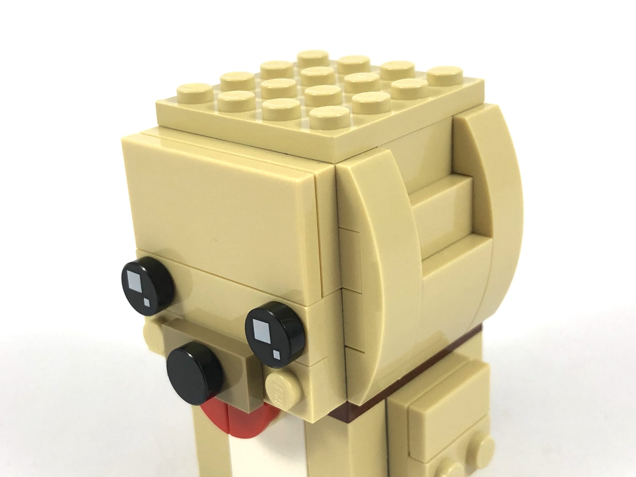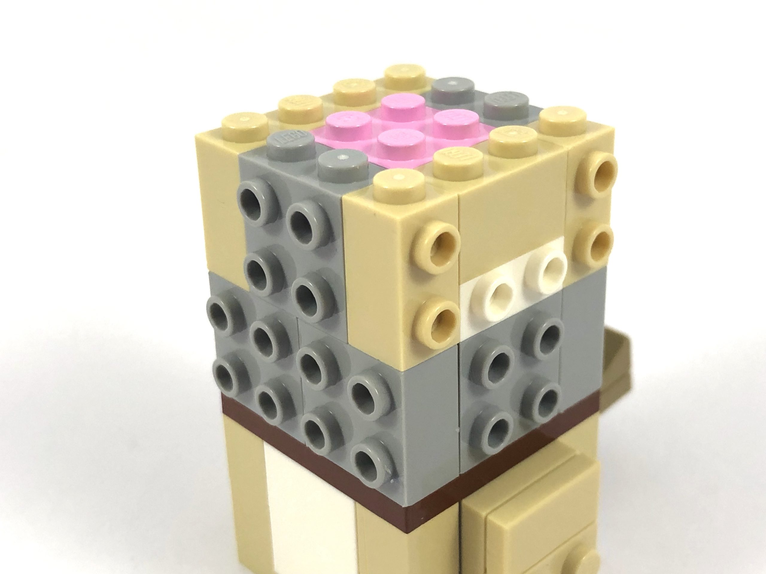 La recette appliquée ici est identique à celle vue dans de nombreuses autres BrickHeadz. Nous commençons par le torse, couleur tan avec le ventre blanc. Un clip permet de fixer la queue.