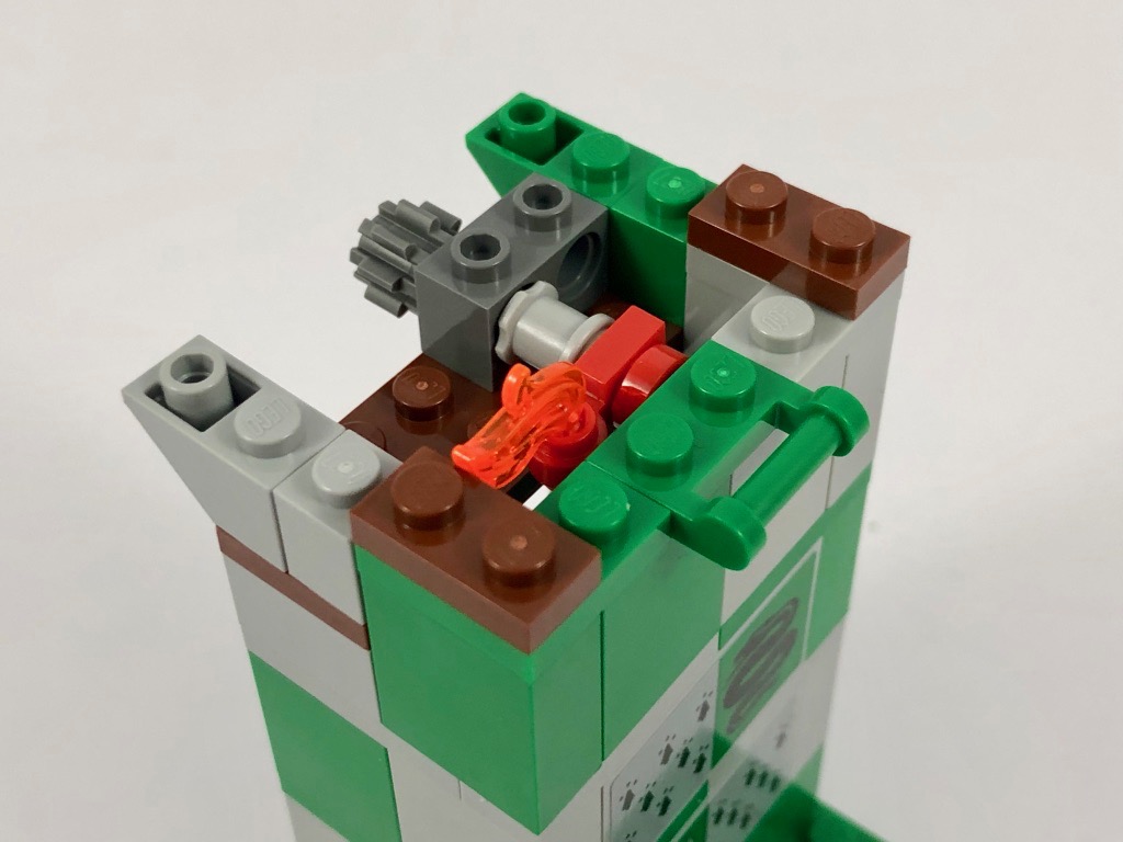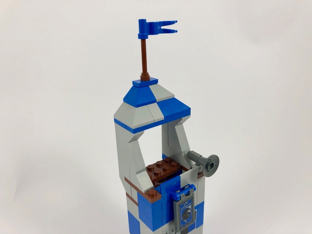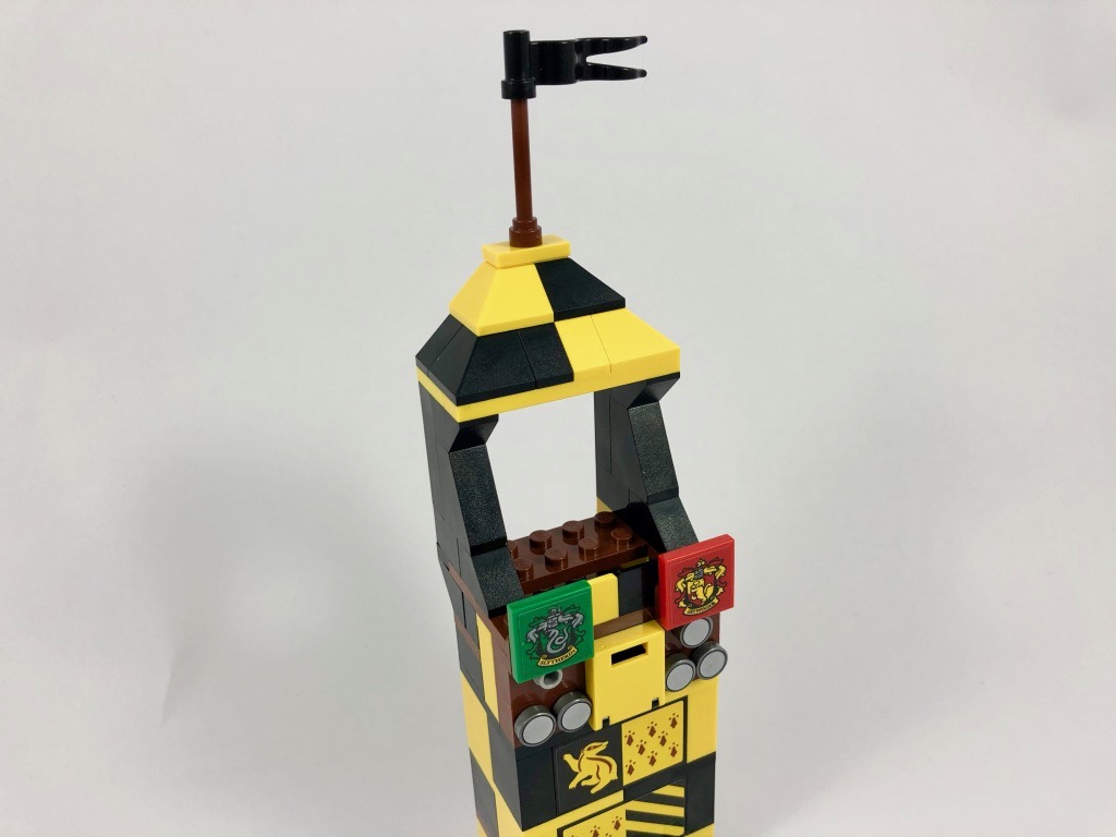 Le troisième et dernier sachet de pièces nous permet de construire une partie du terrain de jeu, plus précisément le « but » côté Gryffondor. Le socle contient un petit mécanisme et une tige transparente qui permet d’y fixer un gardien et de le faire se balader devant les anneaux. Le tout est sommairement habillé de vert, de reddish brown et de tan, avant d’y ajouter les 3 anneaux situés à 3 hauteurs différentes, et un stud shooter pour assomer Harry en plein vol. On termine en fixant les tribunes de Poufsouffle et Serdaigle de chaque côté de ce terrain. On notera que les socles de toutes les tribunes disposent de trous, qui permettent donc de fixer celles que l’on souhaite au terrain de jeu. Par contre, deux tribunes restent « libres », rien n’étant prévu pour les fixer au reste du modèle