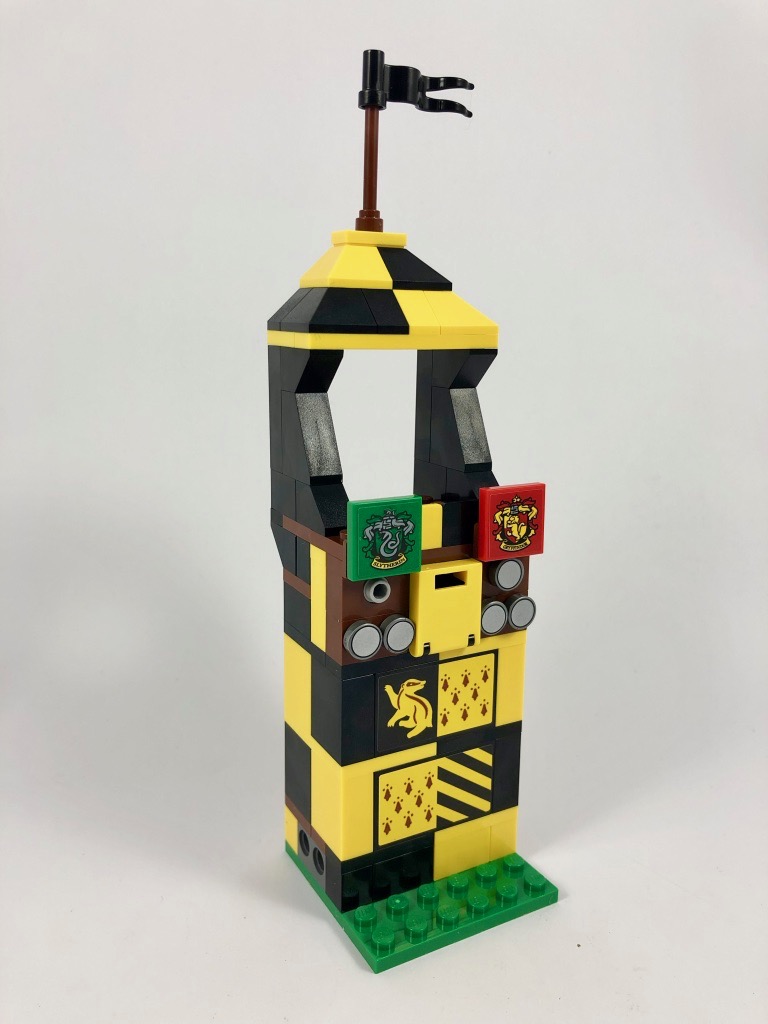 On commence par Gryffondor, où une petite play feature est intégrée dans la base : la partie avant de la base est articulée sur deux pins Technic, de sorte qu’il est possible de faire passer un joueur au travers. Pour le reste, il s’agit d’un assemblage assez simple de briques rouges et jaunes, aux couleurs de la maison. Les gradins sont en fait une simple plate en reddish brown, couverte par une toiture composée de quelques slopes et surmontée d’un drapeau.