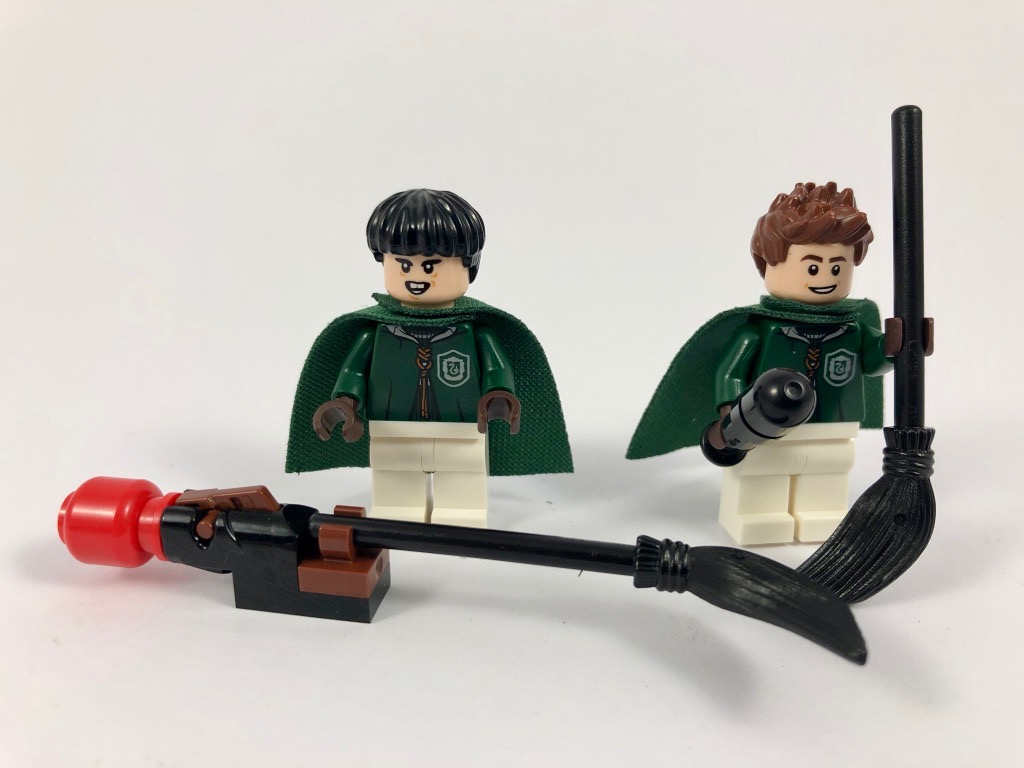 Deux joueurs également pour Serpentard, avec Marcus Flint et Lucian Bole. Tous deux portent la tenue de quidditch de leur équipe, et disposent d’un balai noir (offert par un généreux donateur). Le visage du premier est sympathique, avec deux dents qui dépassent et quelques ridules pour un rictus de vilain plutôt réussi. Celui du second est plus classique. Tous les deux disposent également d’un accessoire supplémentaire. Un stud-shooter est attaché au balai du premier pour lancer le souaffle au travers des anneaux, tandis que le second dispose d’une batte, logique pour son poste de batteur au sein de l’équipe.