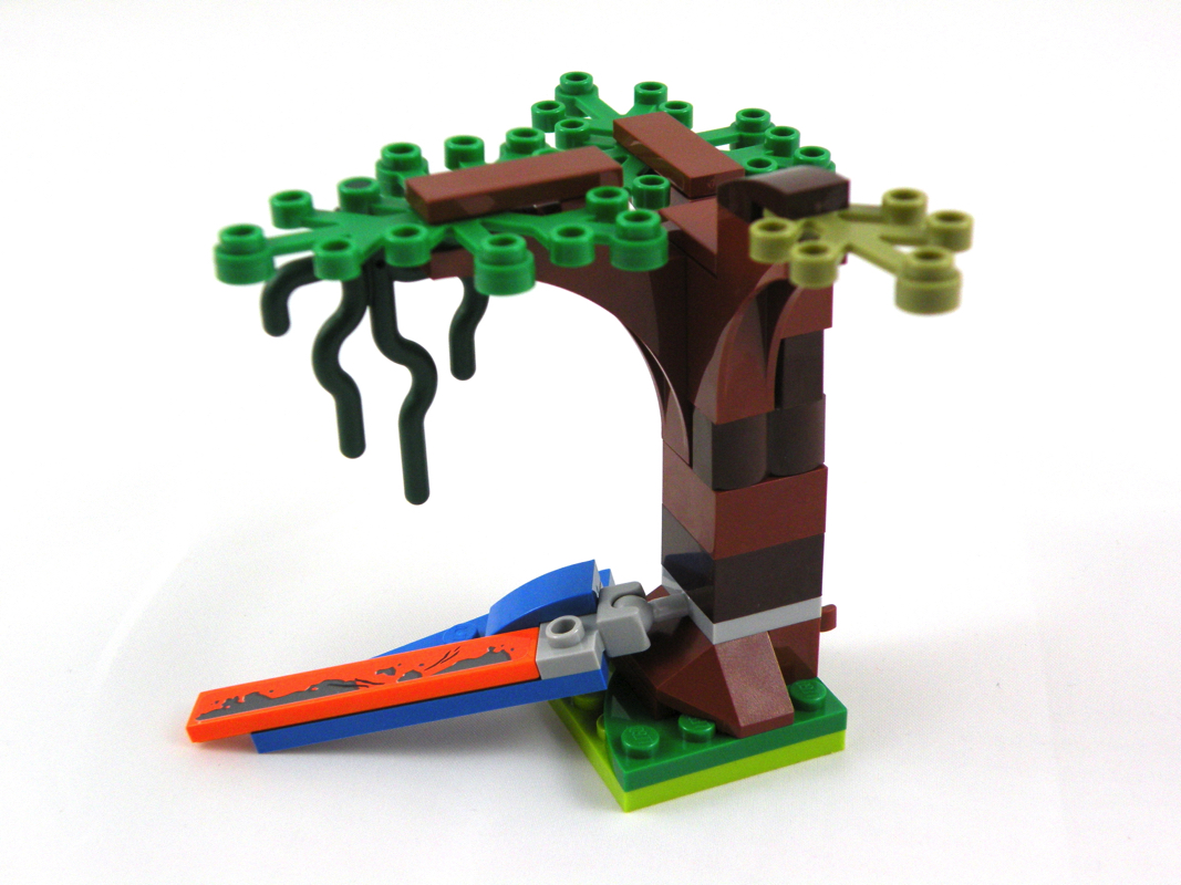 En fait de forêt, il s’agit plutôt d’un arbre, plutôt bien réussi si on en juge par le faible nombre de pièces utilisé pour le réaliser. On assemble ici tout simplement l’arbre sur une base en lime, et un arbre en mélange de dark brown et de reddish brown. Pour les feuilles, un mélange de trois couleurs, entre le green, le dark green et le olive green. Et le détail qui tue, la portion d’aile du Milano, fixée à l’arbre à l’aide d’un ball joint, qui permet de faire penser que Rocket est en train de défendre le site du crash.