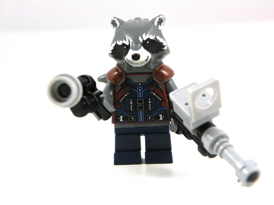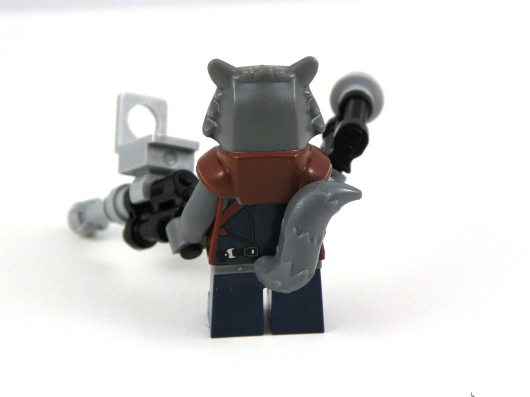 Petites jambes qui ne plient pas, à la manière des hobbits ou des enfants, pour notre Rocket. Rien à voir avec la version de Rocket sortie en 2014, avec son costume orange. Ici, le pantalon est en dark blue et la veste en reddish brown, avec une jolie tampographie très détaillée. La tête et les épaules sont solidaires, on ne peut donc pas tourner la tête de Rocket. Le petit sourire narquois est tout à fait ce qu’on attend de voir sur ce personnage, ainsi que son armement. Comme vous pouvez le constater, il est armé jusqu’aux dents. Un peu trop peut-être, puisqu’il est impossible de le faire tenir debout avec son attirail. Je me suis personnellement servi du grand fusil comme d’une « béquille ».