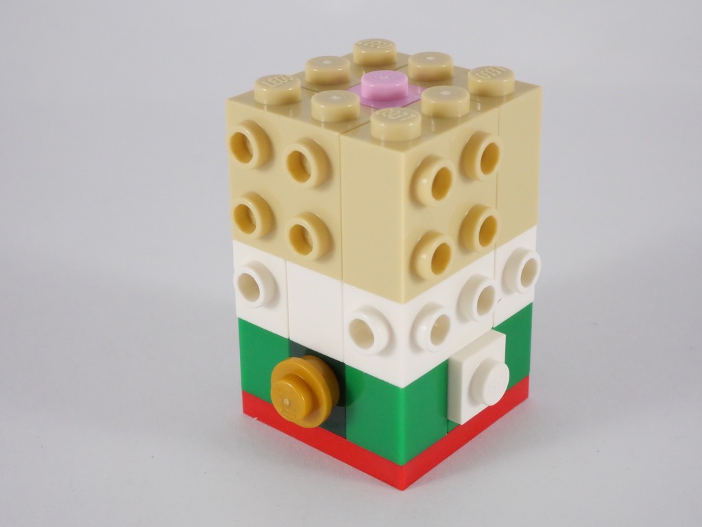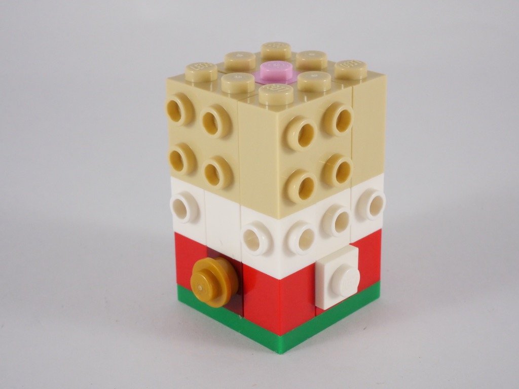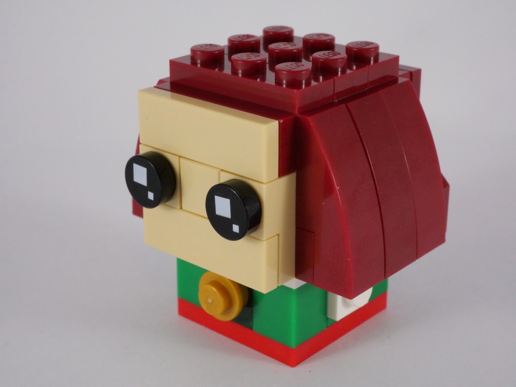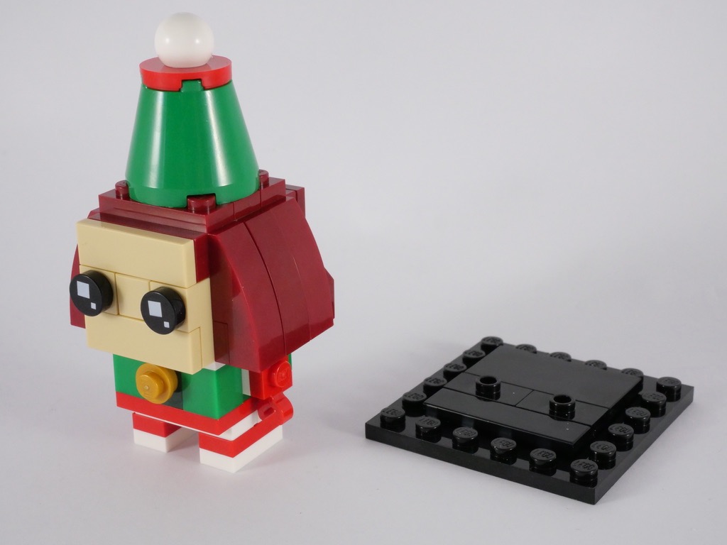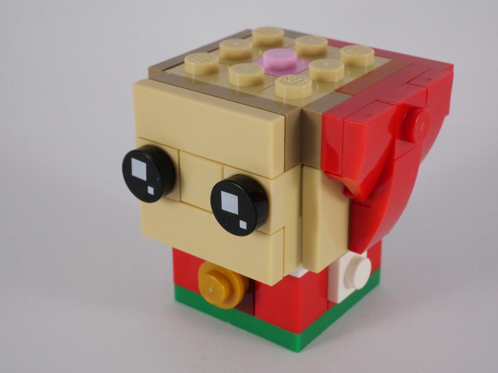 La construction commence par l’Elfe. Si vous avez déjà goûté à l’assemblage des « petites » BrickHeadz de 3×3 tenons, vous ne serez pas dépaysé. Sur une plate verte, une rangée de briques constitue le torse. Un cube de 3x3x3 tenons constitué de briques SNOT le surplombe, on en habille les différentes faces puis la partie supérieure. Avant de finir le bonnet, nous ajoutons les jambes (deux plates de 1×2 tenons) et les bras (2 clips). On termine le bonnet avec 4 pièces servant habituellement à la réalisation des toitures, avec 2 pentes. On notera la construction asymétrique plutôt sympa, le bonnet tombant sur l’oreille gauche du personnage. Ne manque que le support d’exposition, qui achève ce premier personnage.