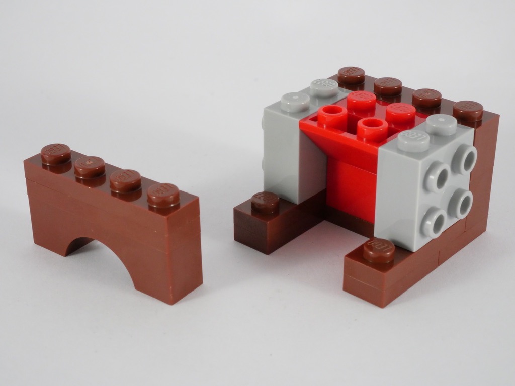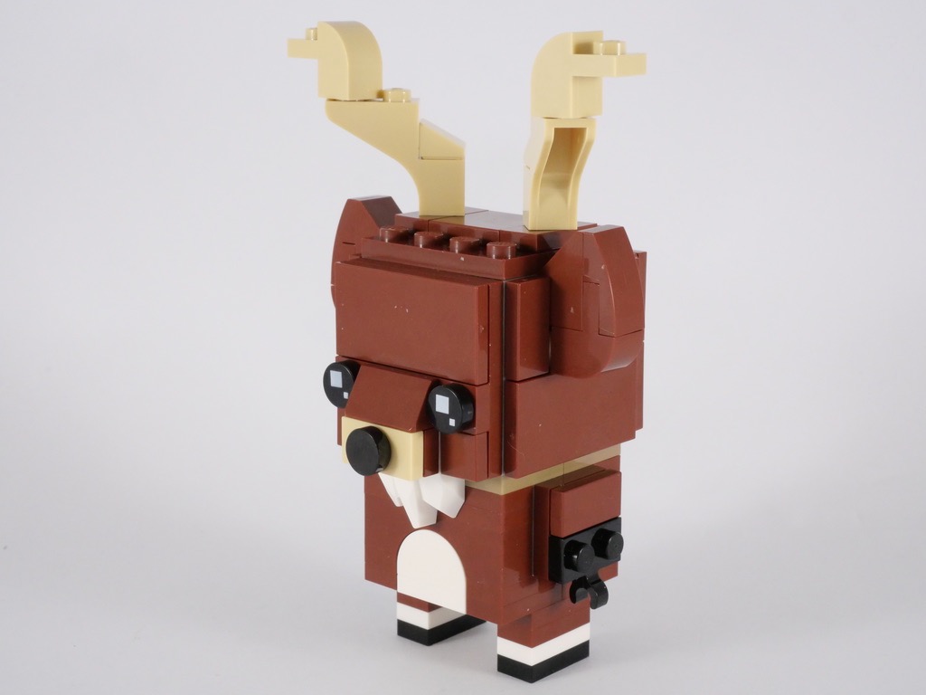 S’agissant d’une BrickHeadz de taille normale (4x4tenons), sa construction diffère quelque peu. On commence par le torse, dans lequel un vide est aménagé sur l’avant avec une arche. On y ajoute les bras constitués des 3 pièces habituelles, puis la structure interne de la tête et ses briques SNOT. On effectue un premier « habillage » des différentes faces du visage, avant de repasser aux jambes. Une pièce courbe est insérée dans le vide aménagé en début de construction pour constituer le ventre de l’animal. On en profite également pour y ajouter les jambes. Nous repassons alors à la tête, où l’on construit les oreilles puis les bois. Ceci achève la construction de ce 3ème et dernier personnage.