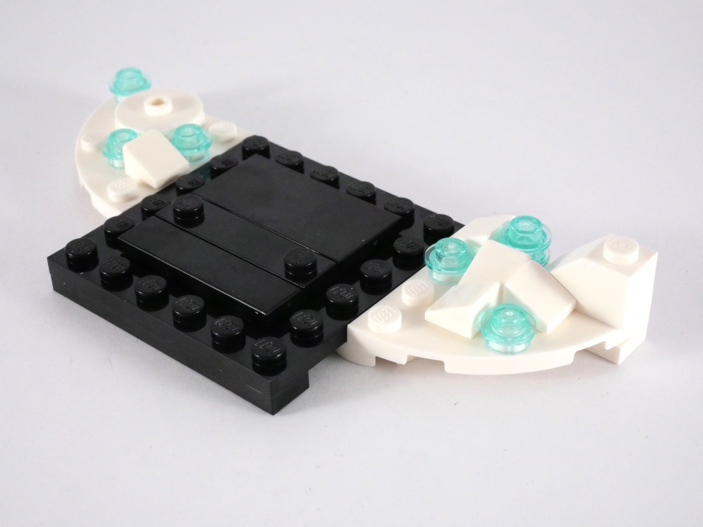 Nous passons alors à son socle d’exposition. Comme les autres BrickHeadz saisonnières, il est basé sur une plate de 6×6 tenons, augmentée de part et d’autre d’un quart de cercle décoré. On y ajoute un peu de neige et de glace avec quelques pièces blanches et trans light blue, puis une boîte aux lettres avec un autocollant de Père Noël et un panneau indicateur lui aussi décoré de 3 autocollants. Ne reste plus qu’à placer le renne sur son support.
