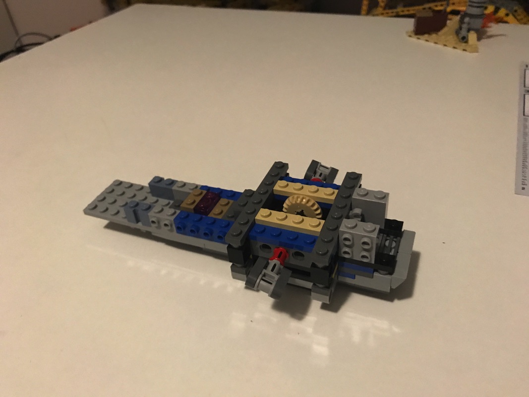 Puis on attaque enfin le vif du sujet, avec l' »ossature » de notre X-Wing. On note la présence d’un système à base d’engrenages Technic, permettant plus tard l’ouverture des ailes du X-Wing.