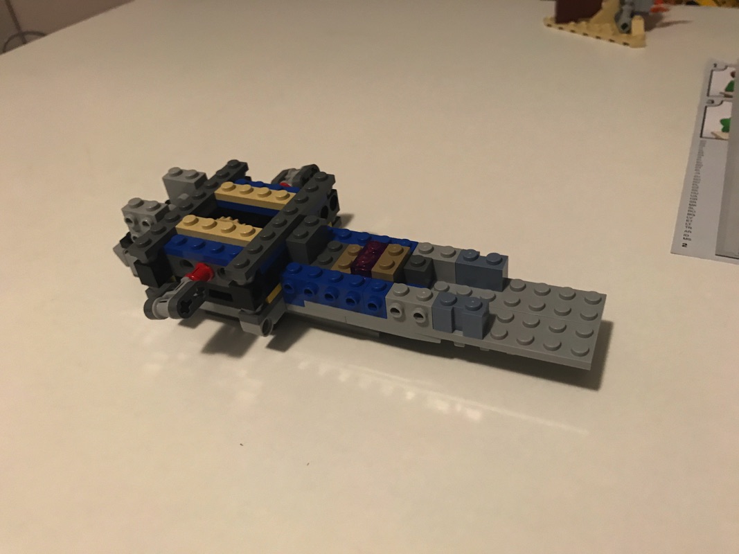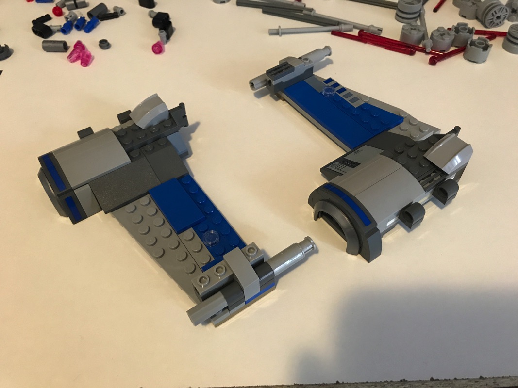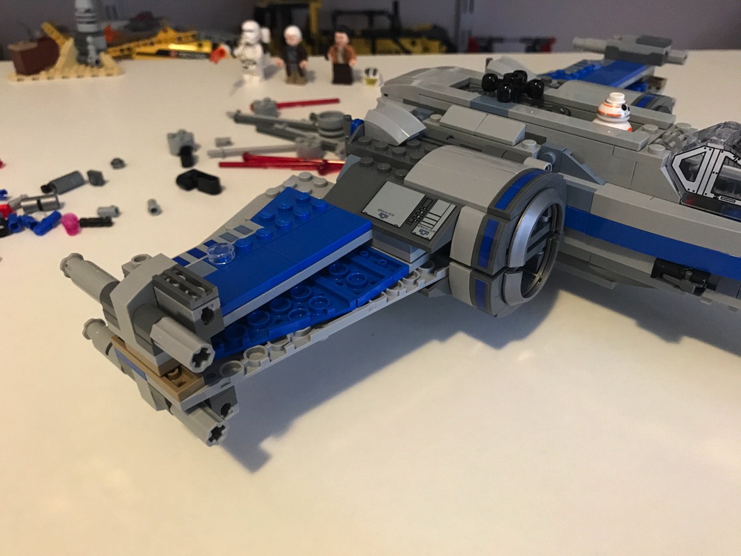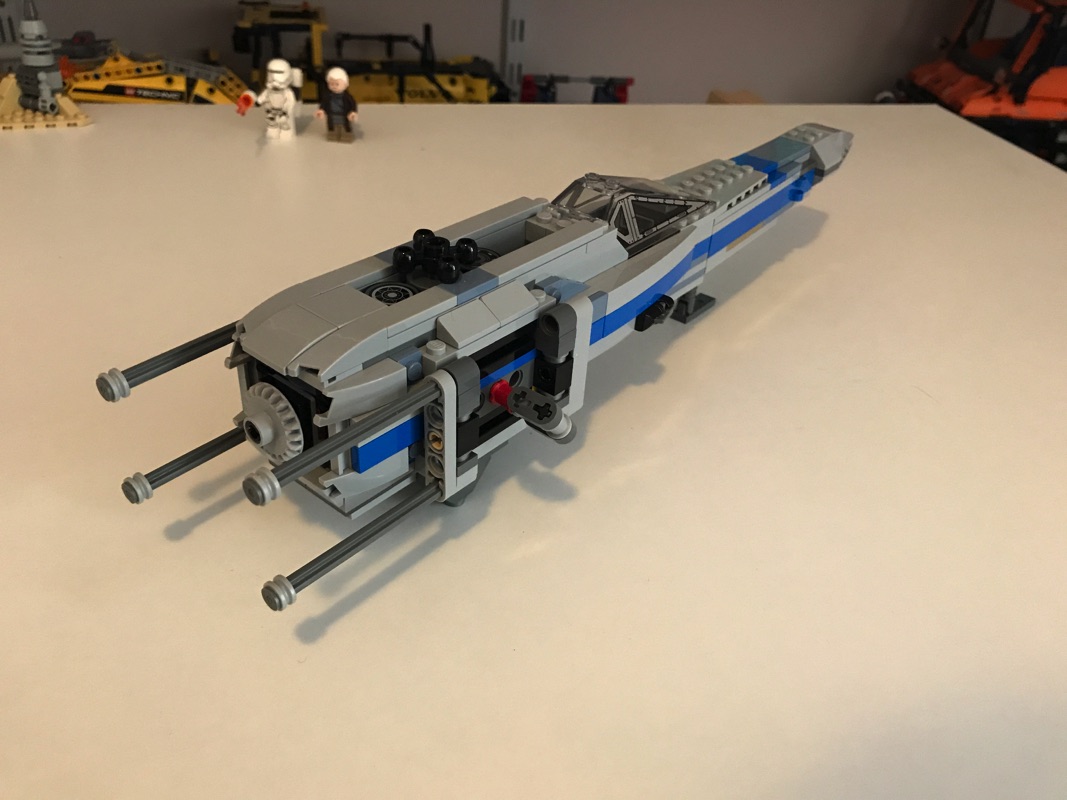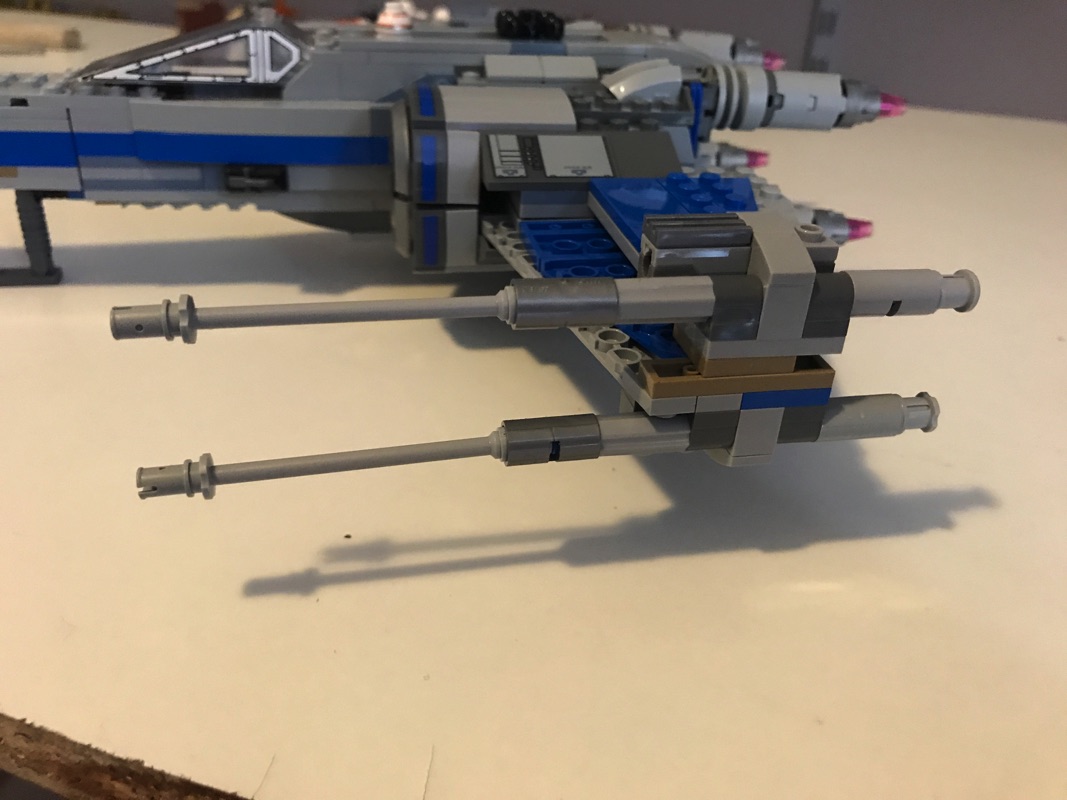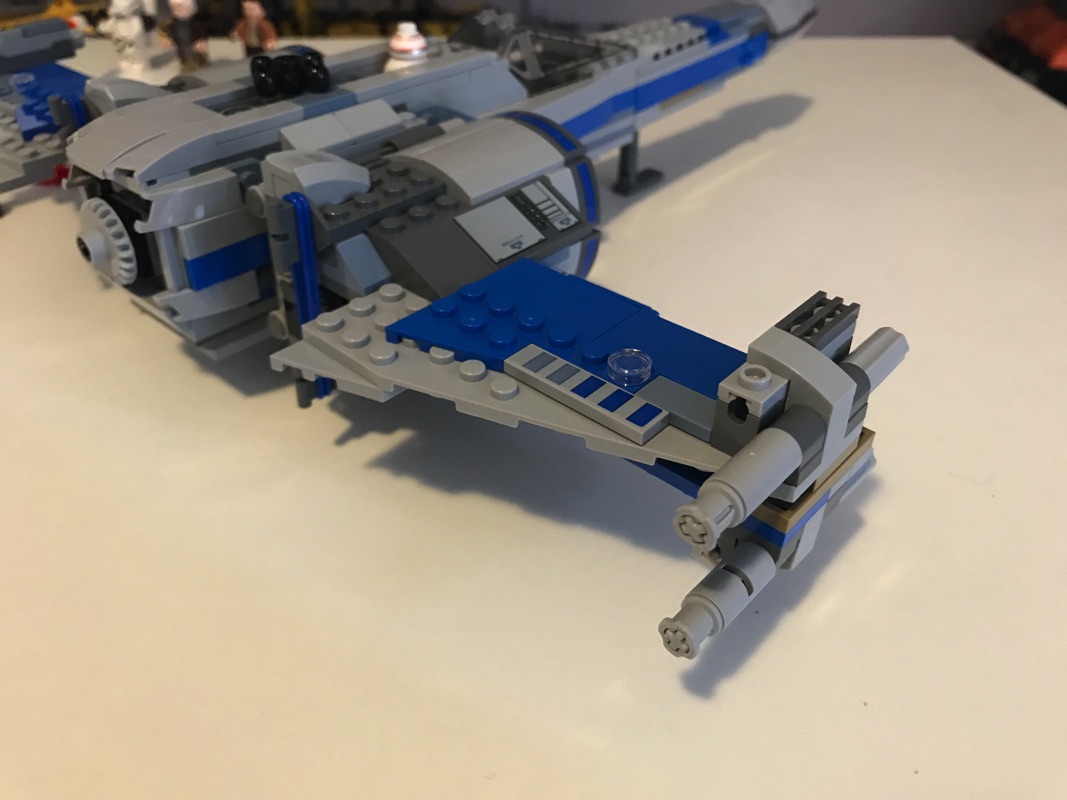 Enfin, on apporte les dernières finitions au vaisseau : les réacteurs à l’arrière, les canons « lasers » sur les ailes à base de pièces disposant d’un ressort (assez puissant au demeurant, la jouabilité n’en est que meilleure) et des blasters disposés de part et d’autre de la cabine.