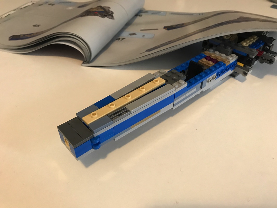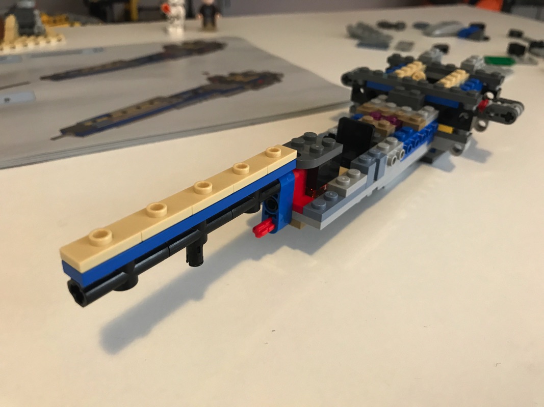 C’est ainsi que se termine la première grande étape de construction. La suite nous permet d’assembler le nez de notre vaisseau, avec un système plutôt bien pensé à base de pins Technic et de charnières nous permettant d’obtenir les angles désirés. On y assemble également l’intérieur du cockpit, avec ses accessoires (une clé et un extincteur) et son tableau de bord « stickerisé ».